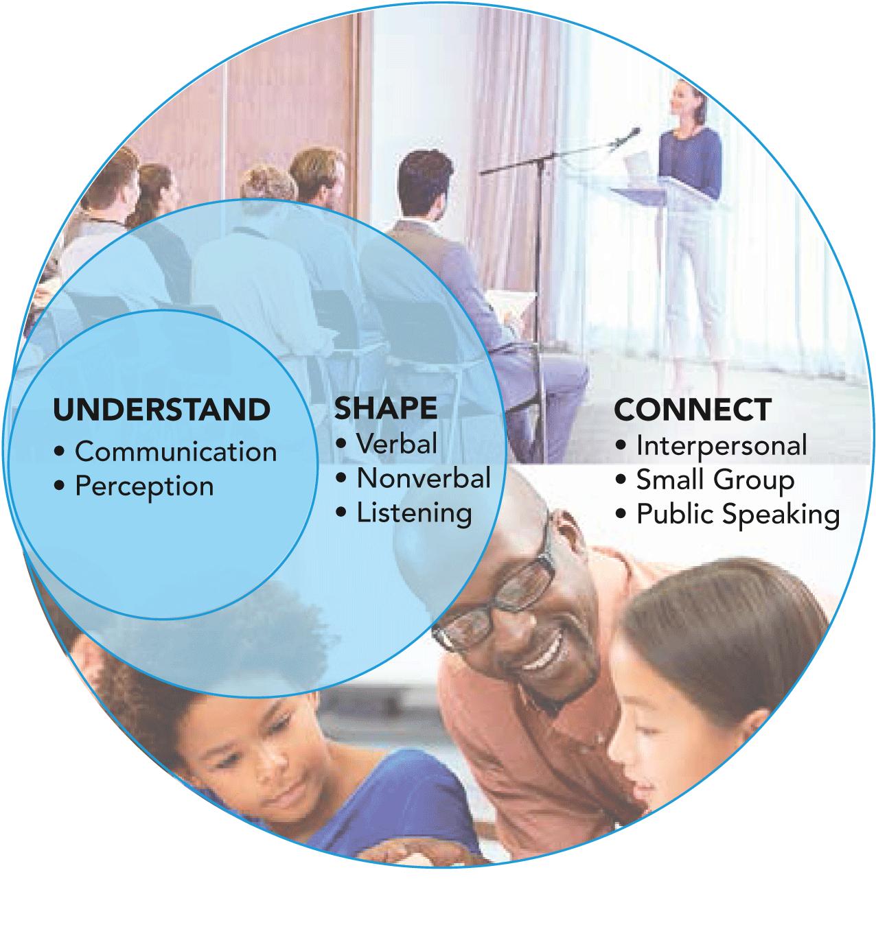 EMPHASIZES THE BIG PICTURE: Studentsareshownhowtoview anyactofcommunicationfromawiderperspective,beginningwith (1)understandingcommunicationfoundations,(2)usingthis knowledgetoshapemessages,and(3)buildingonbothofthese areastoconnectwithothersininterpersonalrelationships,small groupinteractions,andpublicspeeches.AninteractiveUnderstandShape-Connectgraphicisusedineachoftheinterpersonal,small group,andpublicspeakingsectionstoemphasizetheirconnections.