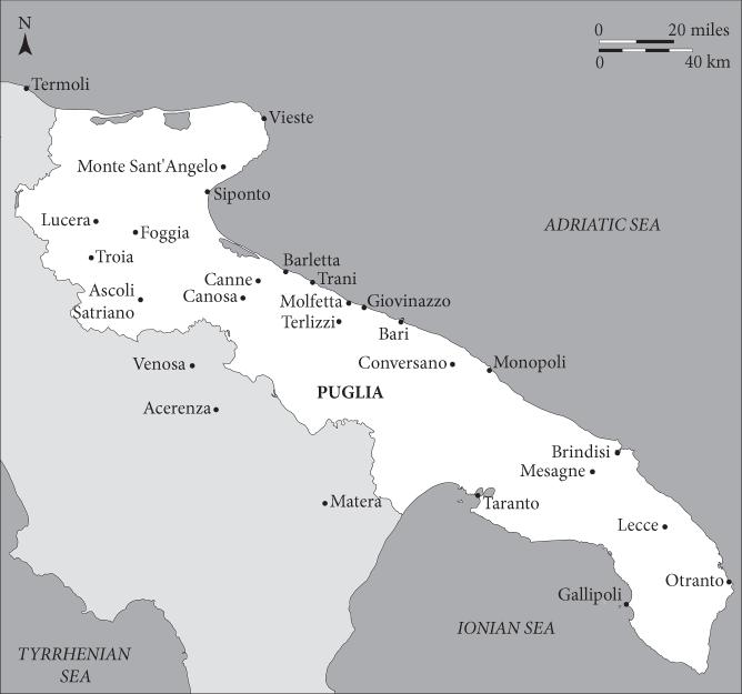 I am so thankful, therefore, to so many colleagues and friends, including Rosanna Alaggio, Edoardo D’Angelo, Joanna Drell, Georg Christ, Charles Insley, Adam Kosto, Markus Krumm, Stephen Mossman, Ian Moxon, Ingrid Rembold, Chris Wickham, and Marino Zabbia. The origins of my own interest in southern Italy can be traced to Graham A. Loud, who never fails to support and inspire me. The origins of my particular interest in Puglia can be traced to Jean-Marie Martin, who sadly passed away during the writing of this book: his magisterial study on the region is awe-inspiring, and his encouragement of my endeavours always meant so much to me.