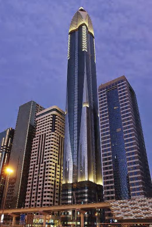 The slender steel and glass tower rises from a relatively small footprint of 10,000 sq ft (929 sq m), requiring the architects and engineers to incorporate the latest structural and architectural solutions in skyscraper design for this 482-key hotel, the tallest all-hotel building on the planet.