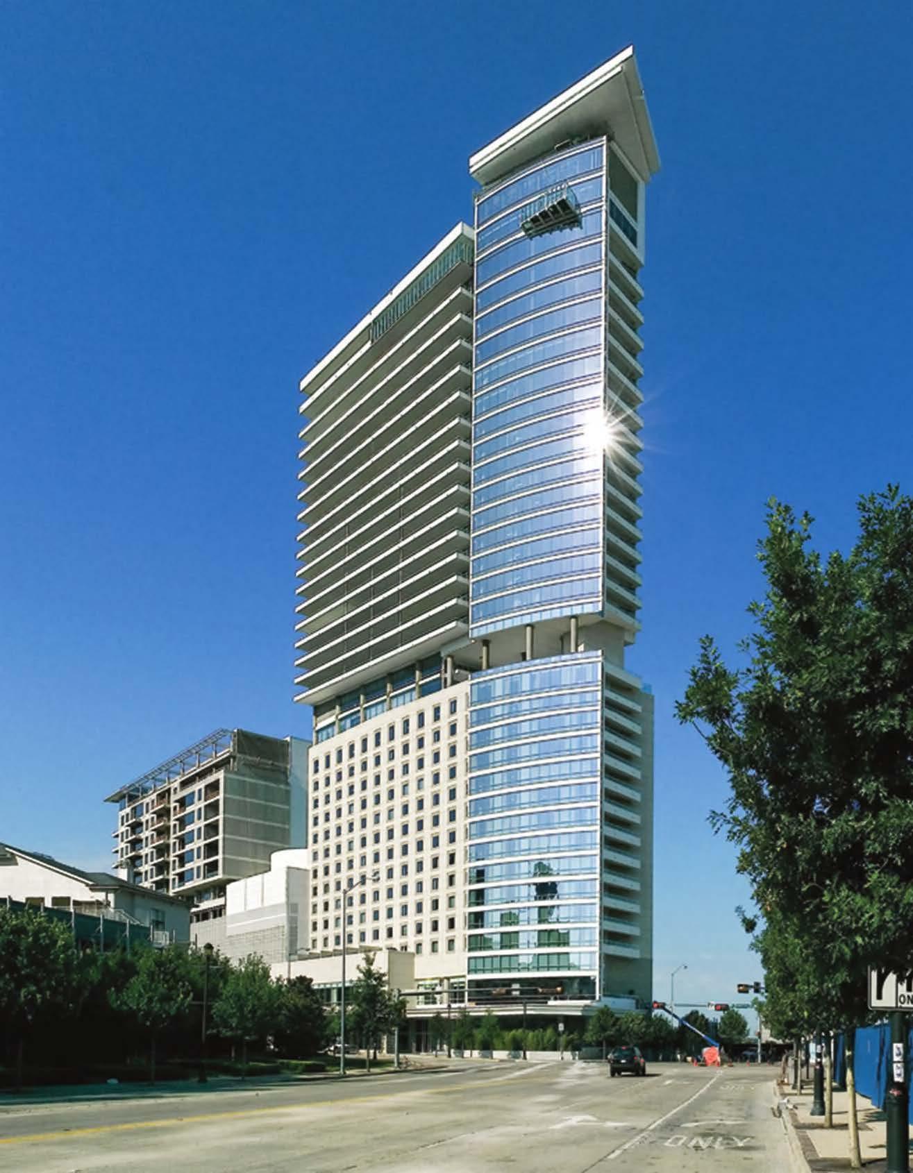 With 252 guestrooms and 94 luxury residences, this 33-story hotel and condominium tower is the centerpiece of the 72 acre (29 hectare) Victory master-planned development in Dallas. Designed by HKS Architects, the hotel includes a 10,000 sq ft (925 sq m) spa, pool, and fitness facility, 11,000 sq ft (1,020 sq m) of meeting space, and Ghostbar, a sleek and stylish rooftop venue.