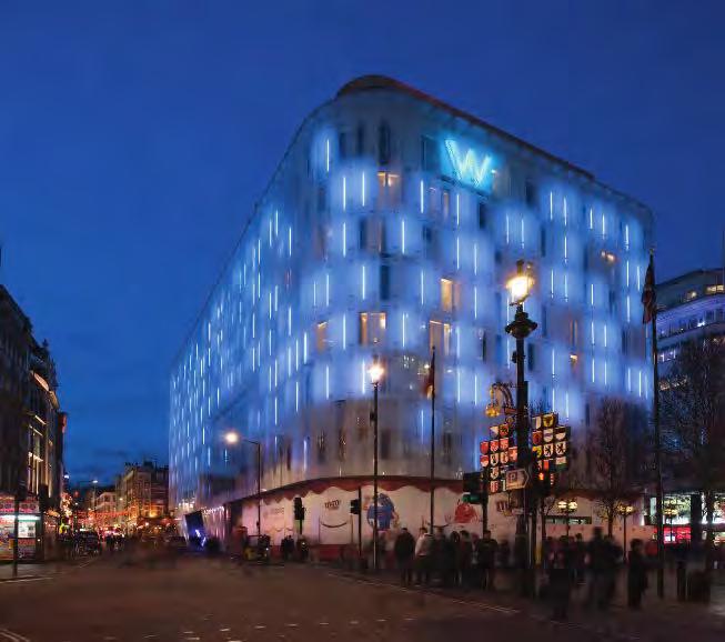 Evoking the cinematic legacy of Leicester Square, the hotel is wrapped with frameless glazing suspended from the face of the building like a floating sheer veil, etched with an undulating pattern like the folds of a theater curtain. Hundreds of energy-efficient light fixtures set into the outer main wall provide an infinite number of combinations and effects, controlled by sophisticated electronics from within the hotel, allowing the presence of the building to alter as day turns to night.