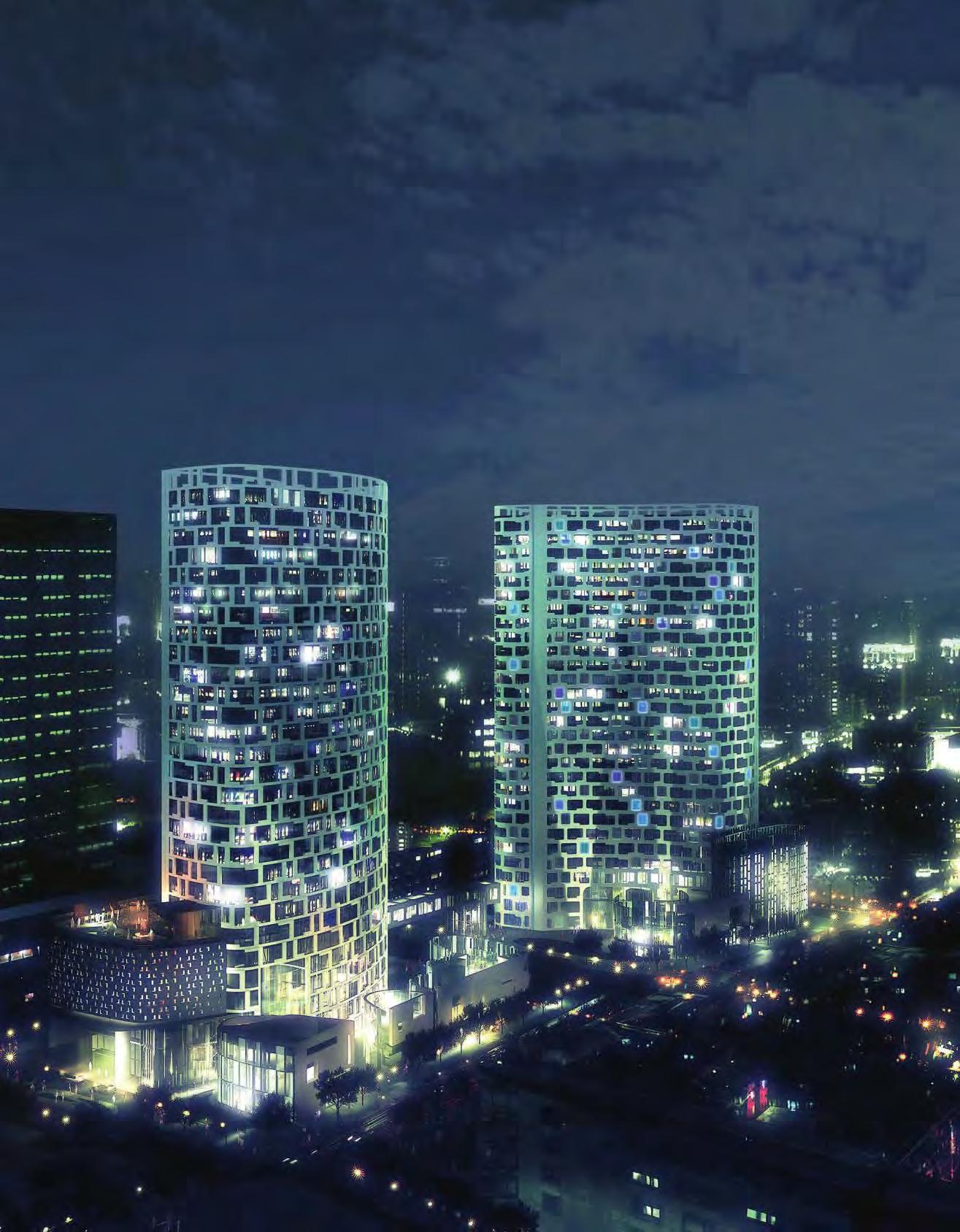 Located next to the Xintiandi district, which is a redeveloped nightlife neighborhood populated by restaurants, outdoor cafés and nightclubs, the two luxuryclass hotel towers are joined by a dramatic curving pedestrian bridge. The façade of the 309-room Andaz is animated by multi-colored LED lighting activated into a random pattern once guests close their blackout shades. The façade of the 357-room Langham is inspired by traditional Chinese latticework (see pp. 47–49).