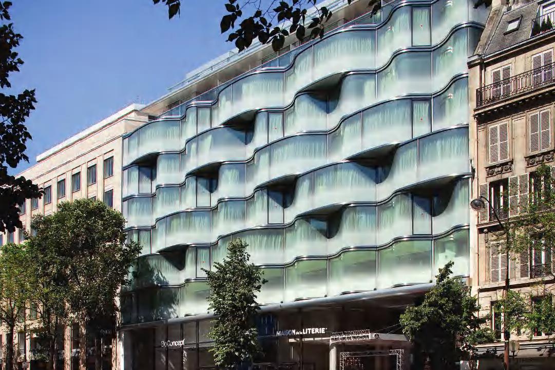 Atelier Christian de Portzamparc designed a striking façade for the hotel with undulating horizontal glazed bands. The undulations become bay windows in the guestrooms, affording views up and down the avenue toward the Arc de Triomphe and Place des Ternes. The hotel has direct and exclusive access to Salle Wagram, the famous banquet and event venue built in 1865, which has been fully restored according to Portzamparc’s design.