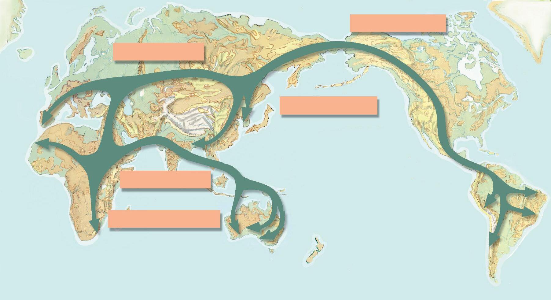 The figure shows proposed migration routes of Homo sapiens after evolution of the species in East Africa. (Redrawn with permission from Cavalli-Sforza, L. L. Genes, peoples and languages. Scientific American, Nov. 1991, p. 75.)