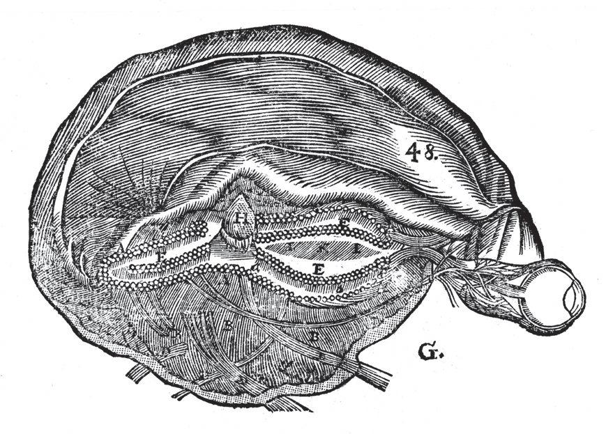 Descartes believed that the “soul” (what we now call the mind ) controls the movements of the muscles through its influence on the pineal body. According to his theory, the eyes sent visual information to the brain, where it could be examined by the soul. When the soul decided to act, it would tilt the pineal body (labeled H in the diagram), which would divert pressurized fluid through nerves to the appropriate muscles.