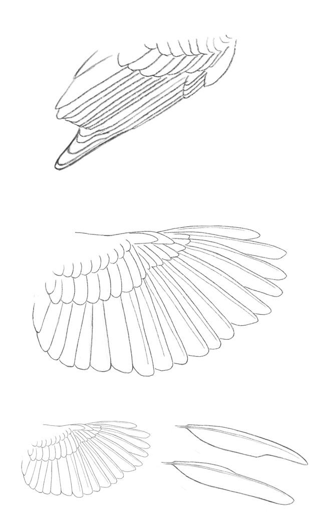 The flight feathers are composed of the secondary and primary feathers, the latter forming the outer flight feathers, and the former the inner flight feathers, as seen on the following diagram (page 13) of an open wing. There are ten primaries and nine secondaries. The primary feathers are referred to with an outward numbering scheme: p1 refers to the innermost and p10 the outermost primary feather. The secondary feathers follow an inward numbering scheme: s1 is the outermost secondary and s9 is the innermost secondary. The three innermost secondaries (s7 to s9) are referred to as the tertials.
