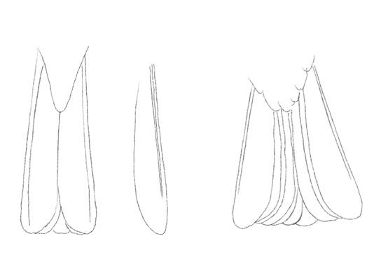 In some cases, understanding the structure of an individual feather is useful when studying feather color patterns. Key parts of the feather are the shaft (rachis) and the feather vanes on the outside and the inside of the shaft (distal to the body): the outer web and the inner web, respectively. For both flight and tail feathers, the width of the outer web is narrower than the inner web. The outer primaries of kingbirds are often notched on the inner web, especially in males. This gives the outer primary feathers in some kingbirds a highly attenuated appearance. Notching is not seen in Myiarchus, but the outer web of Myiarchus primaries often pinches out completely toward the tip, a feature termed as emargination.