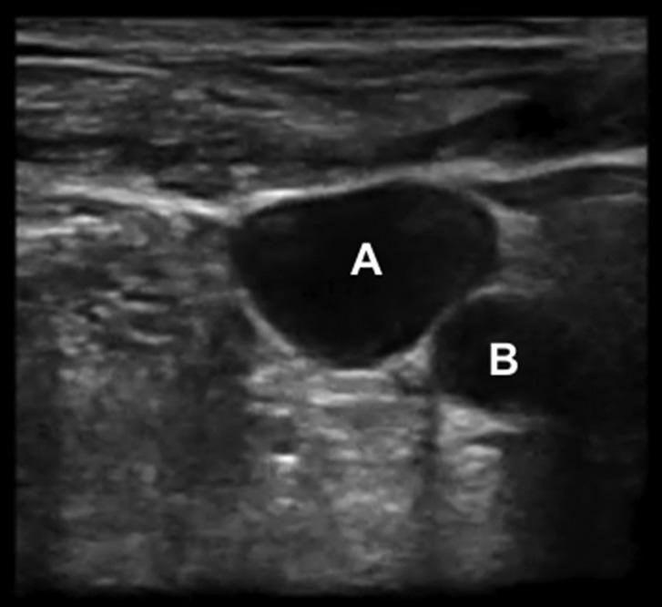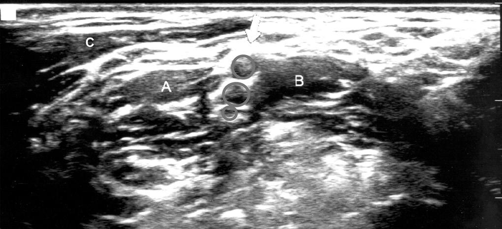 Figure 1.9 Ultrasound image of the brachial plexus at the location for the ISB. At this level, the roots of C5, C6, and C7 appear as hypoechoic circles between (A) the anterior and (B) middle scalene muscles, deep to the (C) SCM muscle.