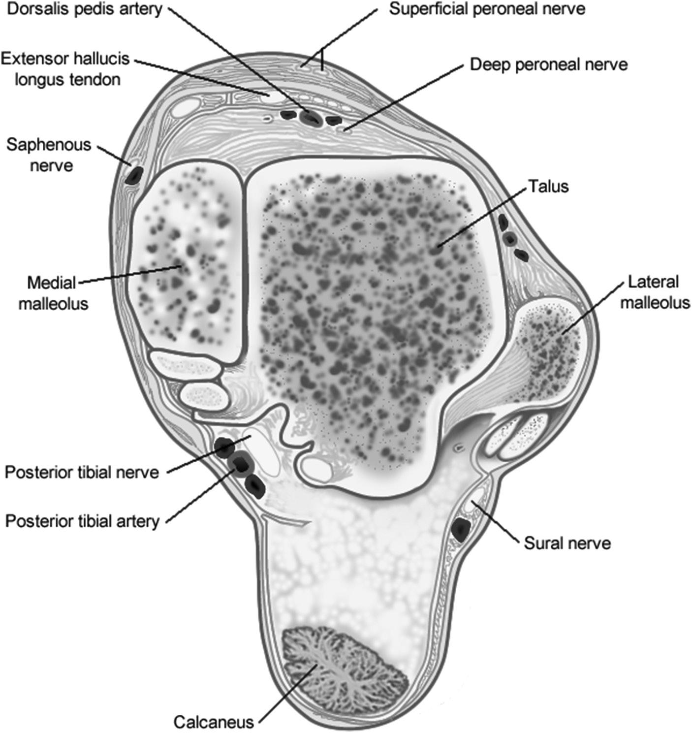 ■ Blocked at the intermalleolar axis by injection posterior to the extensor hallicus longus tendon