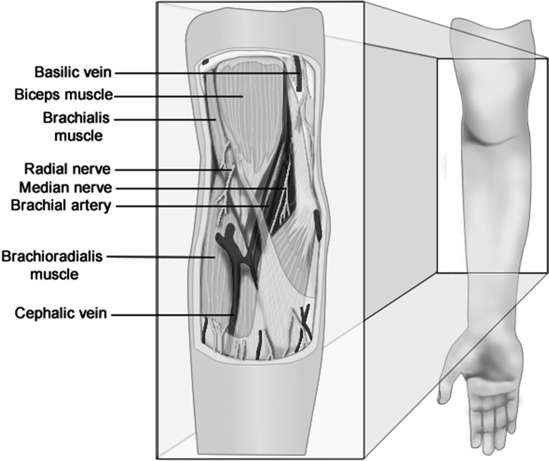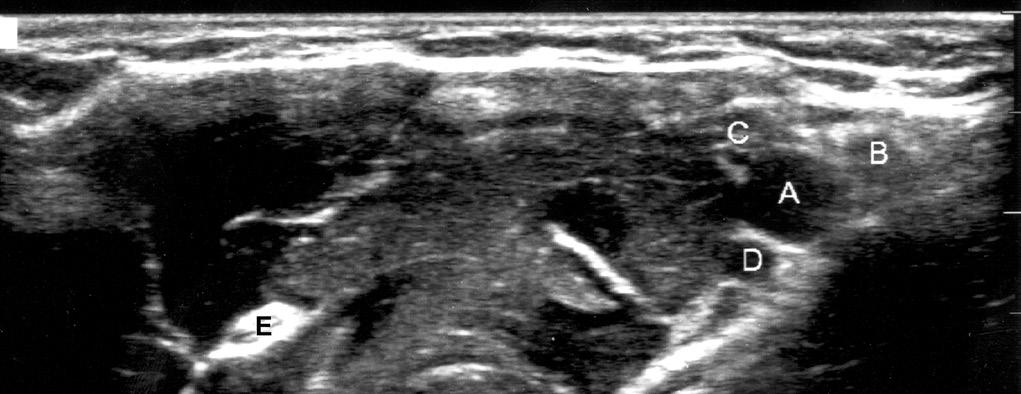 Figure 1.10 Ultrasound image of the brachial plexus at the location for the axillary block. (A) The axillary artery is surrounded by the (B) median, (C) ulnar, and (D) radial nerves. (E) The musculocutaneous nerve is seen laterally within the coracobrachialis muscle.