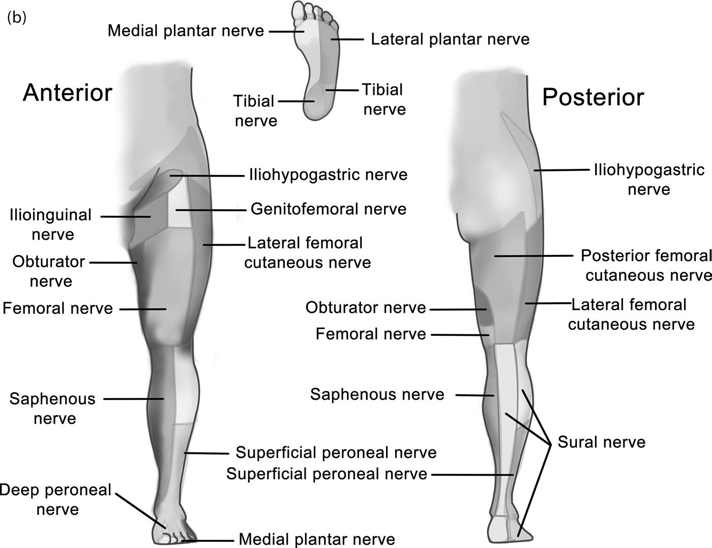 Cutaneous innervation of the distal lower extremity, ankle, and foot is supplied by a combination of five nerves – four derived from the sciatic nerve and one derived from the femoral nerve (Figure 1.8).