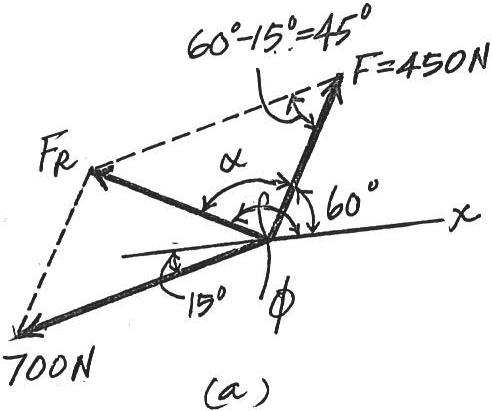 If and , determine the magnitude of the resultant force and its direction, measured counterclockwise from the positive x axis 450 N 60°