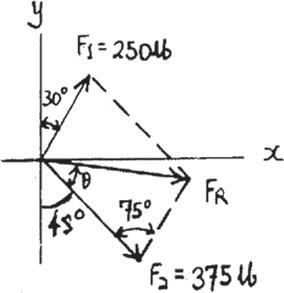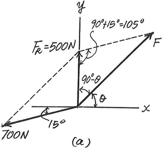 F = 2 5002 + 7002 - 2(500)(700) cos 105°