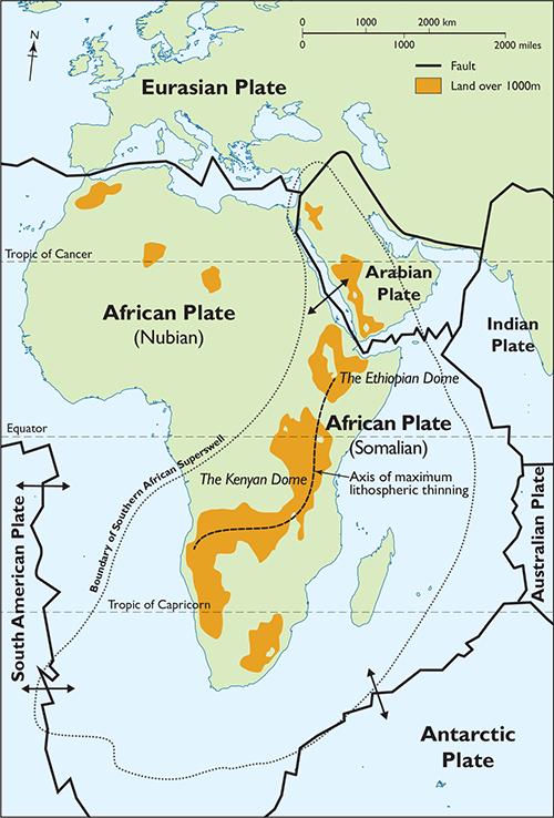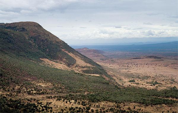1.4 The rift valleys are defined, for much of their length, by steep cliffs where the earth’s crust has fractured and the plates have moved apart. The lowlands between provided congenial environments favourable to the evolution of humans, the wide corridors encouraging migration. The image is of the Great Rift Valley in Kenya.