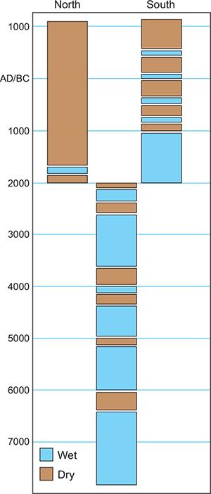 1.6 Even in comparatively small regions like the Western Sahara there were times when the effects of climate change differed from one subregion to another. The diagram shows that after 2000 BC the northern part of the Sahara remained continuously dry while the southern regions enjoyed episodes of more humid weather.
