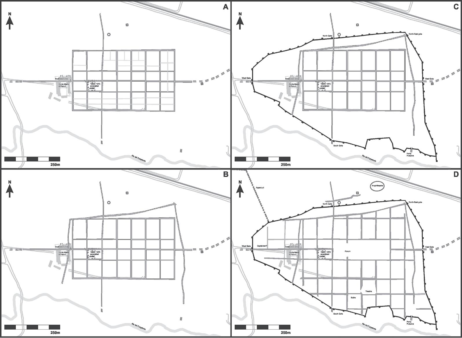 Figure 2.2. Suggested phasing of the plan of Falerii Novi based on an analysis of the gradiometry survey: (A) the primary street grid, (B) the development of the peripheral road around the primary grid, (C) the construction of the walls and (D) the southern extension of the street grid up to the walls (illustration by Paul Johnson, based on Keay et al. 2000).