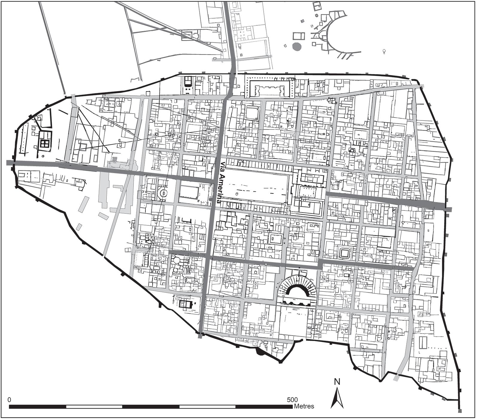 We have already noted the oddity of the peripheral street, interpreted as a processional route, that runs round the primary grid (par 2.3.2; also par. 2.3.7), but the GPR survey also provides other information about routes through the town. The main north–south route along the via Amerina seems to have been key and this is reflected in its unusual width (Fig. 2.3). There remains a question about the slightly offset position of the North Gate, the evidence for which has been made clearer by the GPR survey, although its interpretation remains difficult. By contrast the east–west route along the ridge is less strongly emphasized and, indeed it is interrupted by the