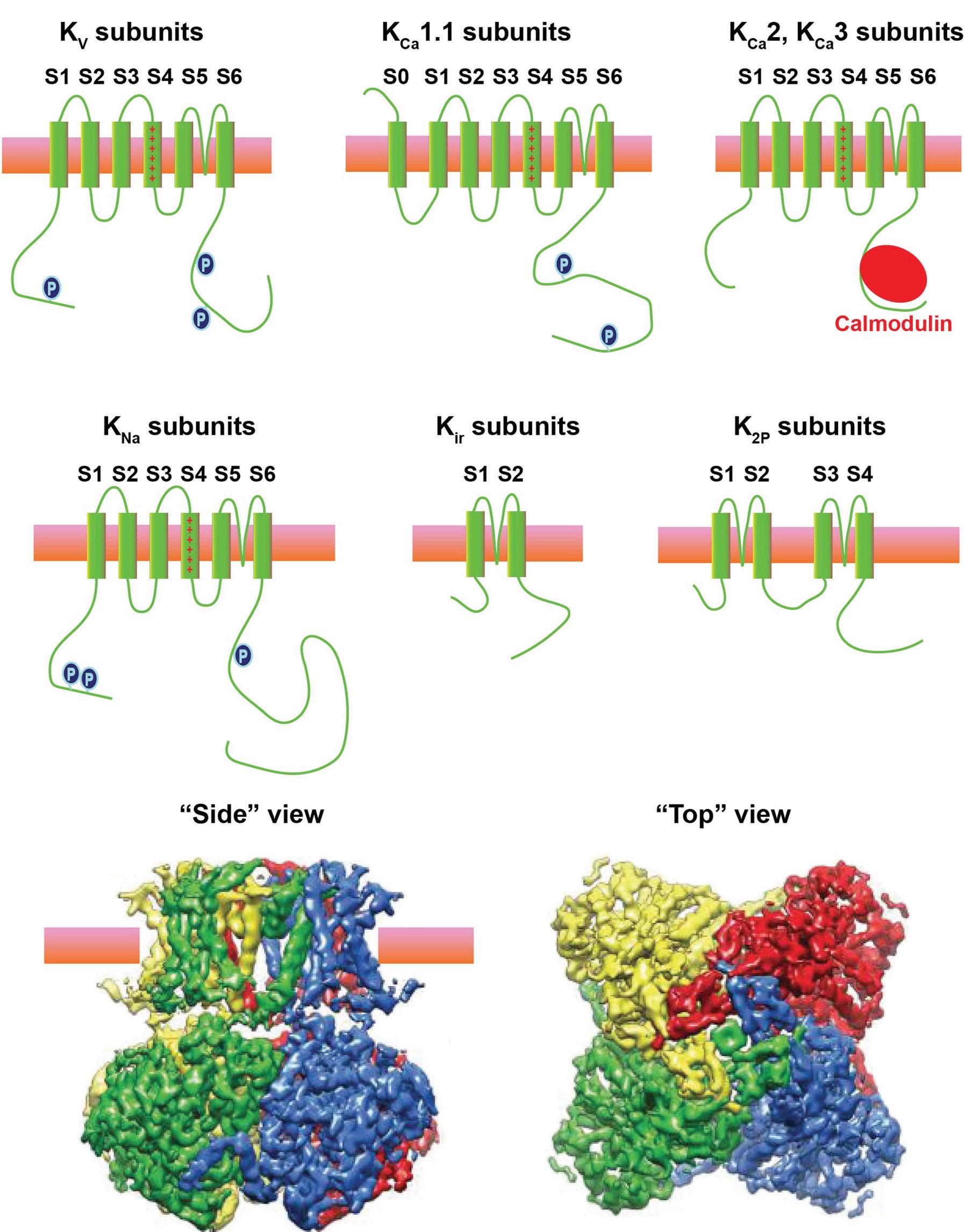 The potassium channel α subunits can be classified into five groups: (1) voltagedependent channels of the KV family, (2) calcium-activated channels (KCa channels), (3) sodium-activated channels (KNa channels), (4) inwardly rectifying channels (Kir channels), and (5) two pore domain channels (K2P channels). The KCa channels can be further divided into two types, large-conductance (KCa1.1, also called big-conductance [BK] channels) and small-conductance (KCa2 and KCa3 channels, also called smallconductance [SK] or intermediate-conductance [IK] channels). A diagram illustrating the transmembrane topology of each of these groups is shown in Figure 1.4A.