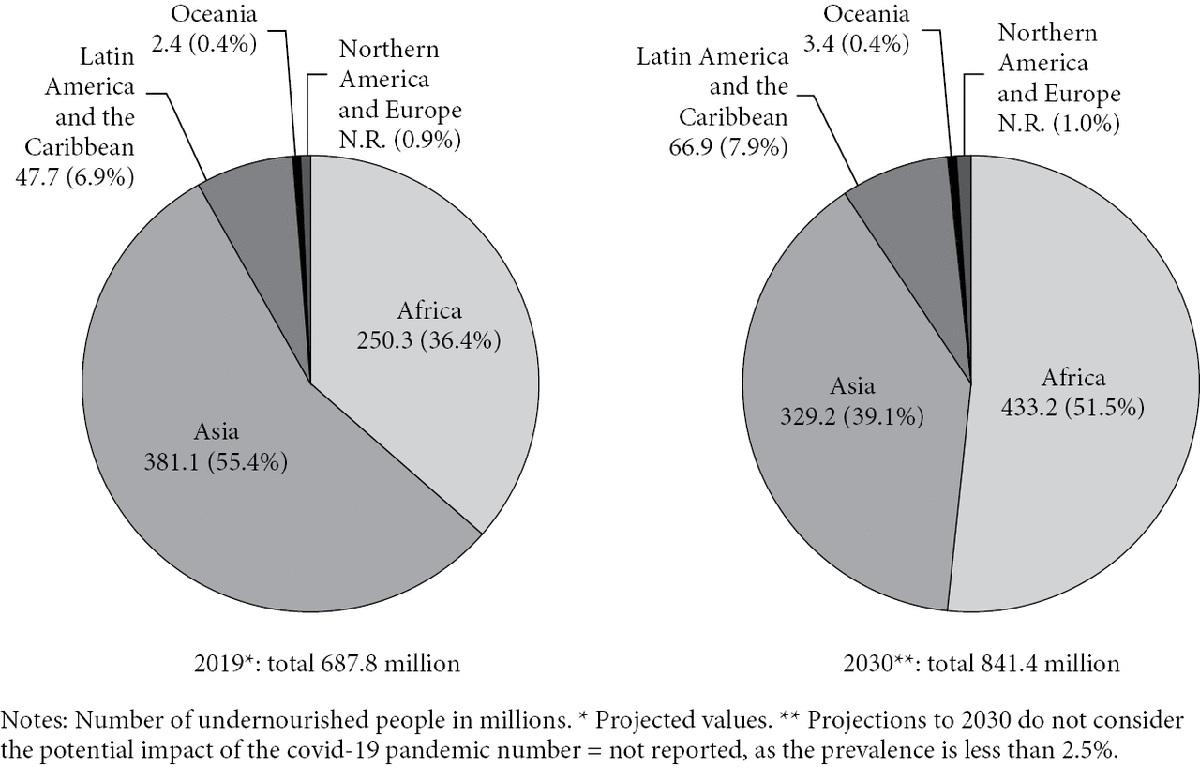 Fig. 1.4 Number of undernourished people in millions globally in 2019; and projections for 2030, without taking the COVID-19 pandemic into account.