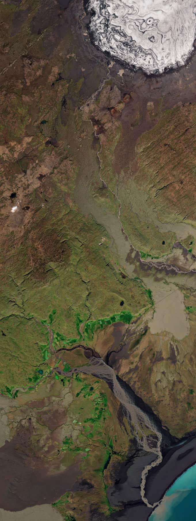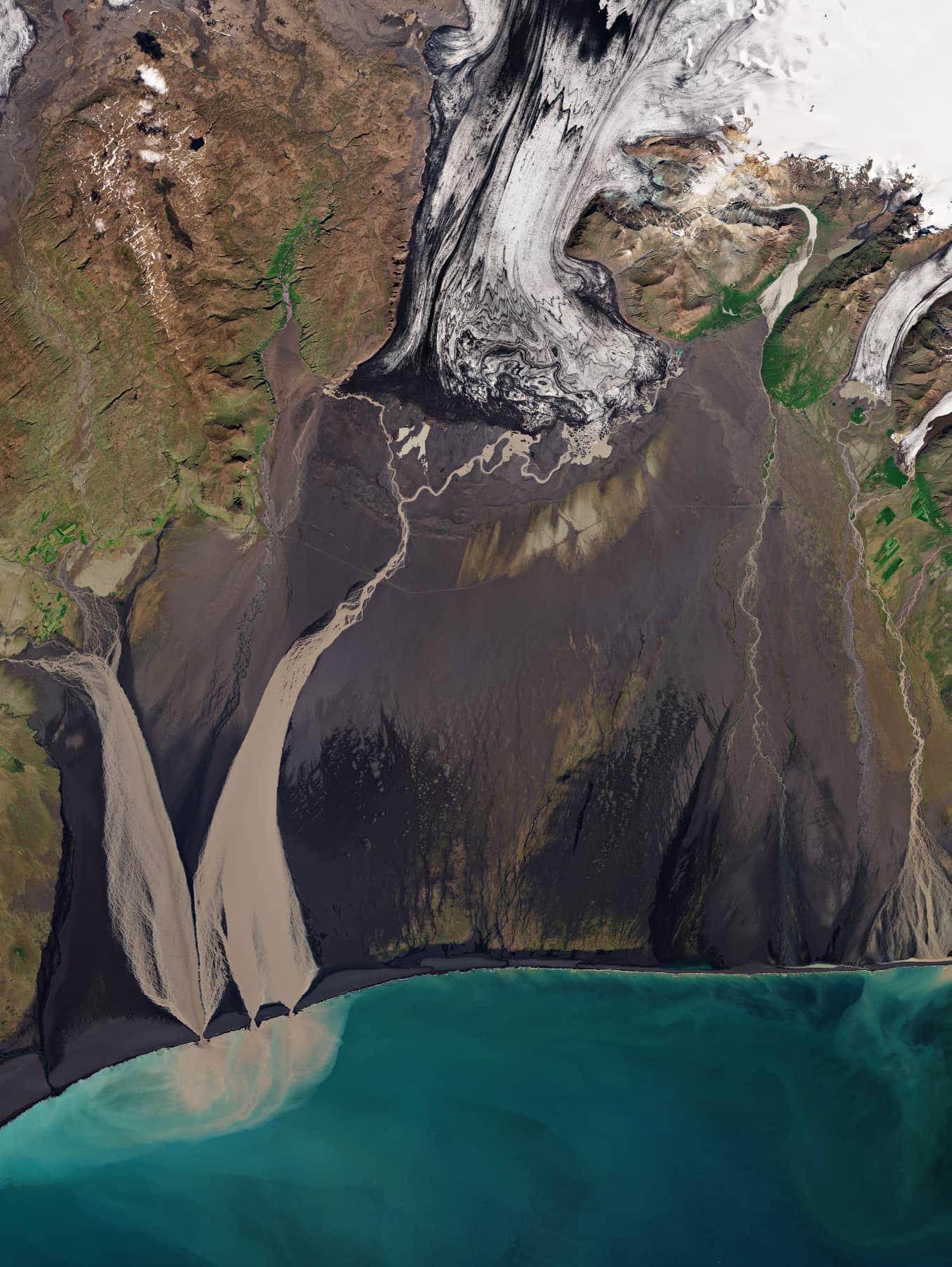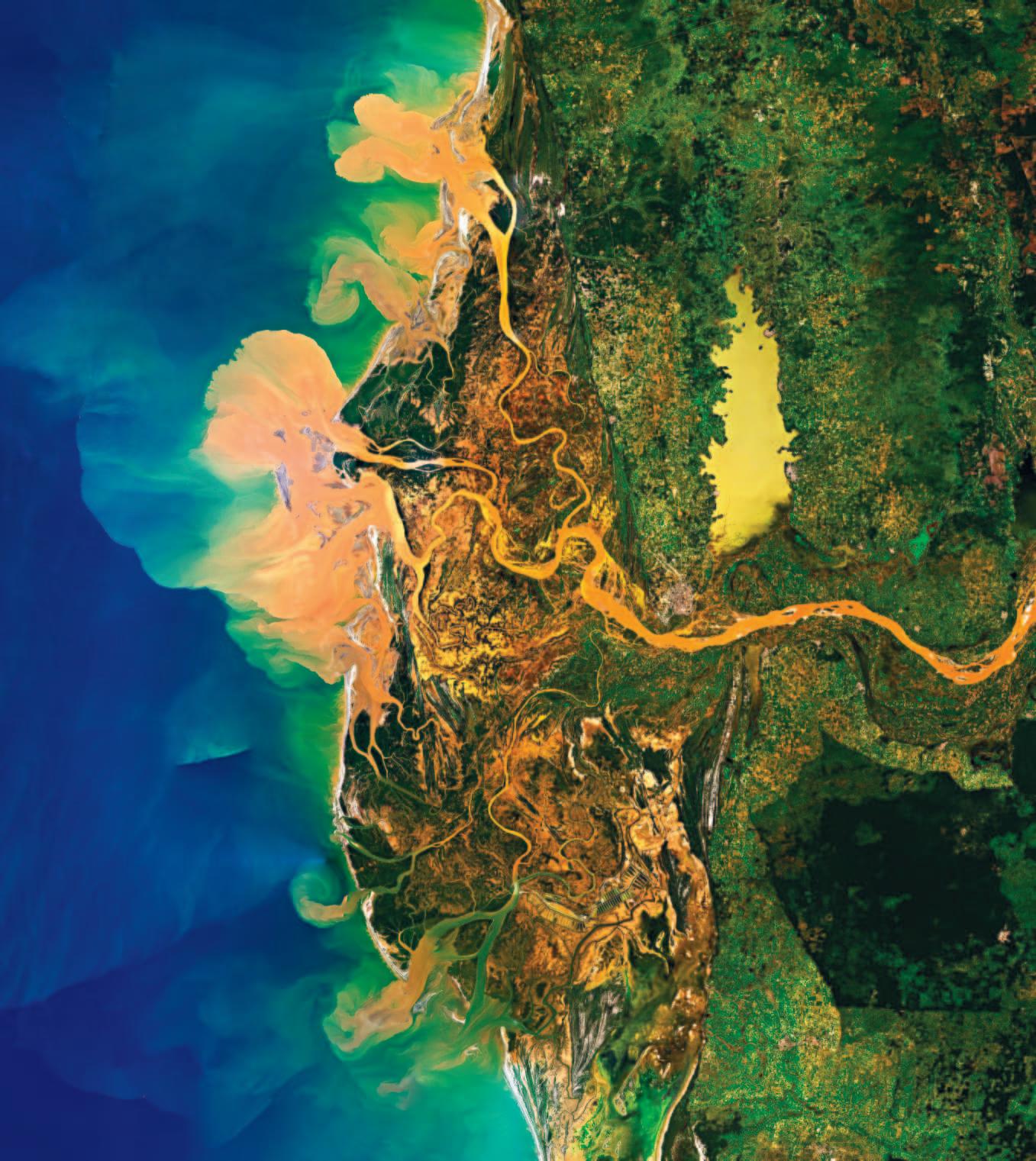 As rivers meet a body of water, they spread out and deposit sediment to form deltas. Here, the sedimentladen Tsiribihina River in Madagascar empties into the Mozambique Channel.