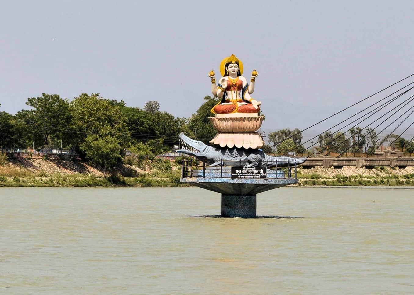 Holy river Statue of the Hindu goddess Ganga on the Ganges River, Rishikesh, India.