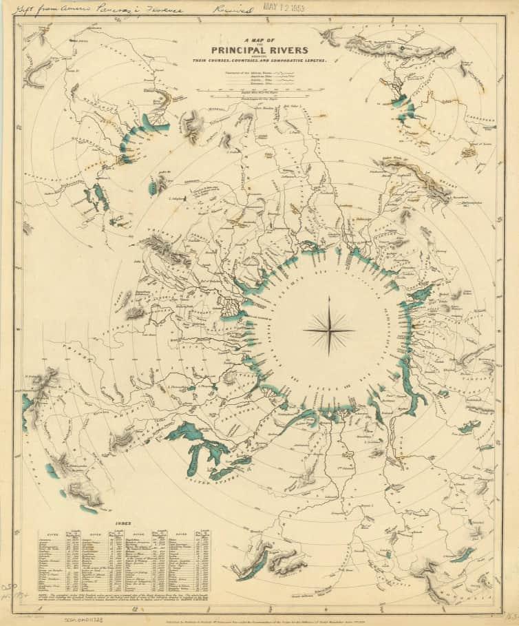 Chart printed in 1834 by the Society for the Diffusion of Useful Knowledge that visualizes and compares the length, planform shape, and general geography of the world’s major rivers, their estuaries, and their deltas. Concentric circles show the general lengths of the rivers, in miles, as the bird flies, with direction being illustrated visually.