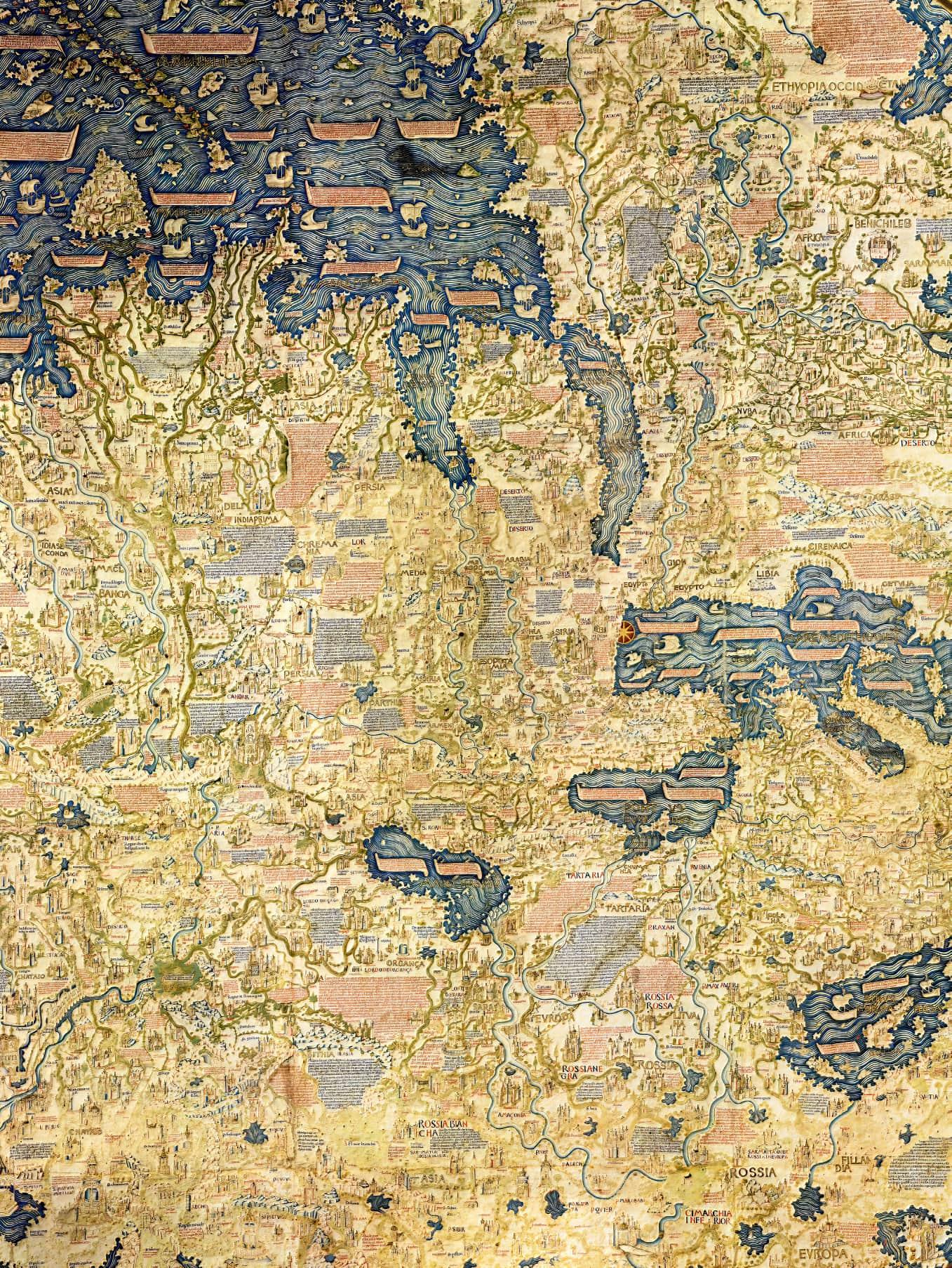 Part of the world map created by Fra Mauro in 1450, oriented with north at the bottom. The Nile, Tigris-Euphrates, and Ganges rivers are all evident on the map.