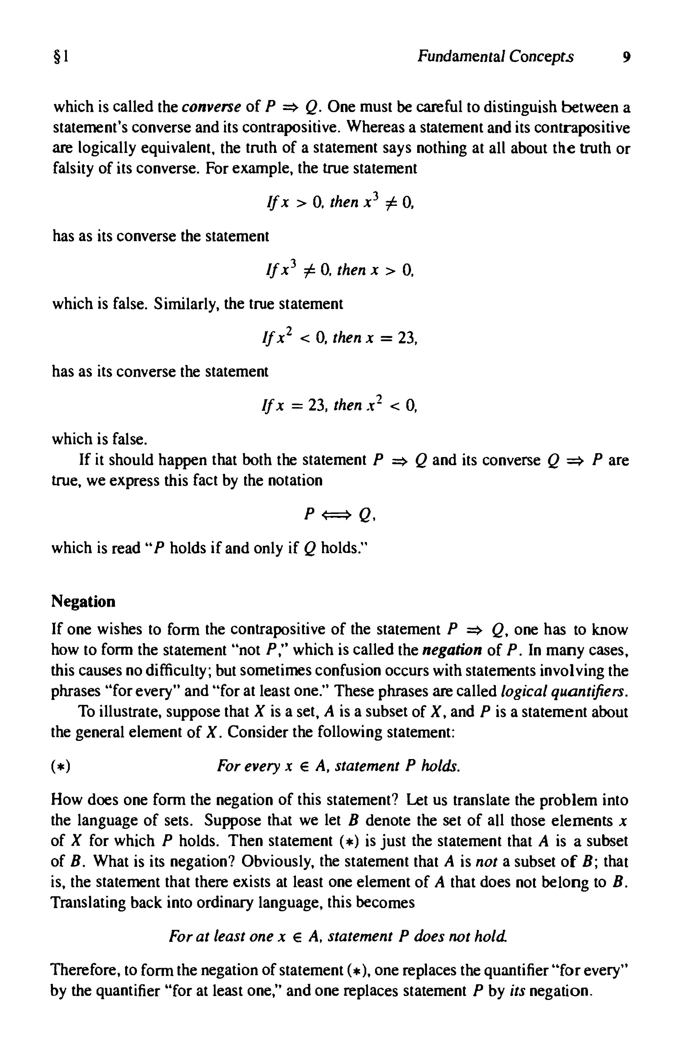 IfonewishestoformthecontrapositiveofthestatementP Q,onehastoknow howtoformthestatement"notP,"whichiscalledthenegationofP.Inmanycases, thiscausesnodifficulty;butsometimesconfusionoccurswithstatementsinvolvingthe phrases"forevery"and"foratleastone."Thesephrasesarecalledlogicalquantifiers.
