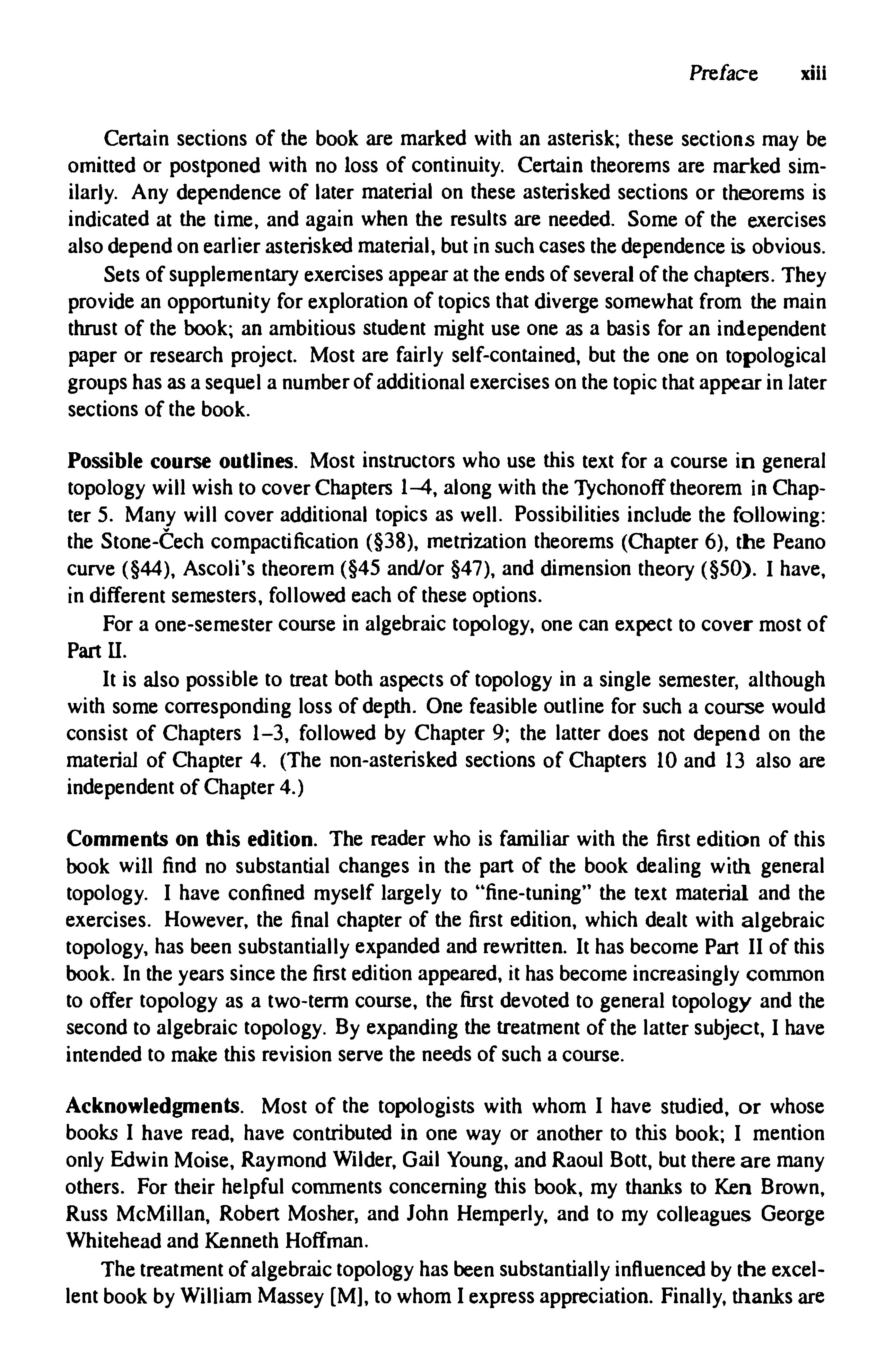 Acknowledgments.MostofthetopologistswithwhomIhavestudied,orwhose booksIhaveread,havecontributedinonewayoranothertothisbook;Imention onlyEdwinMoise,RaymondWilder,GailYoung,andRaoulBott,buttherearemany others.Fortheirhelpfulcommentsconcerningthisbook,mythankstoKenBrown, RussMcMillan,RobertMosher,andJohnHemperly,andtomycolleaguesGeorge WhiteheadandKennethHoffman.