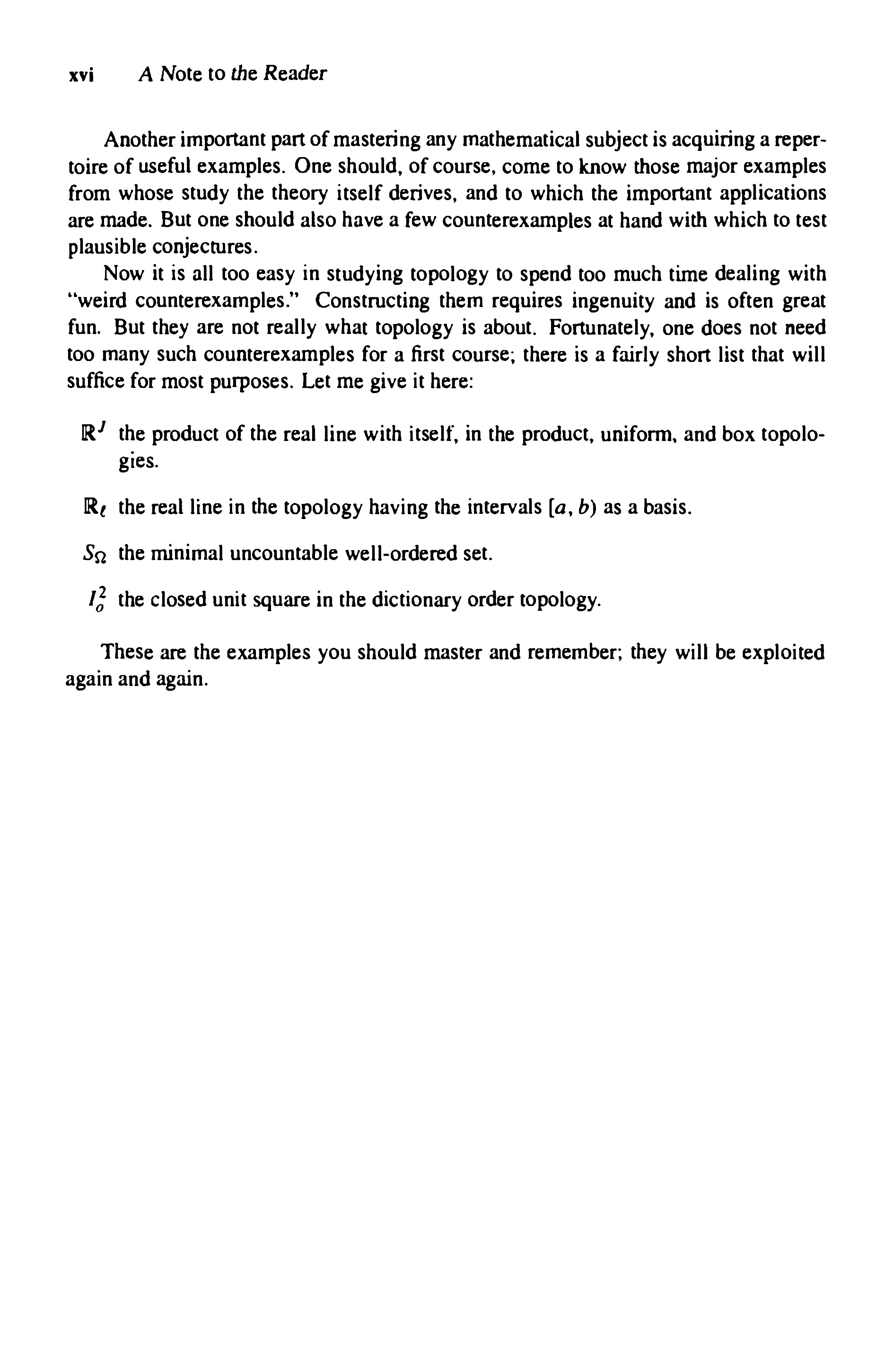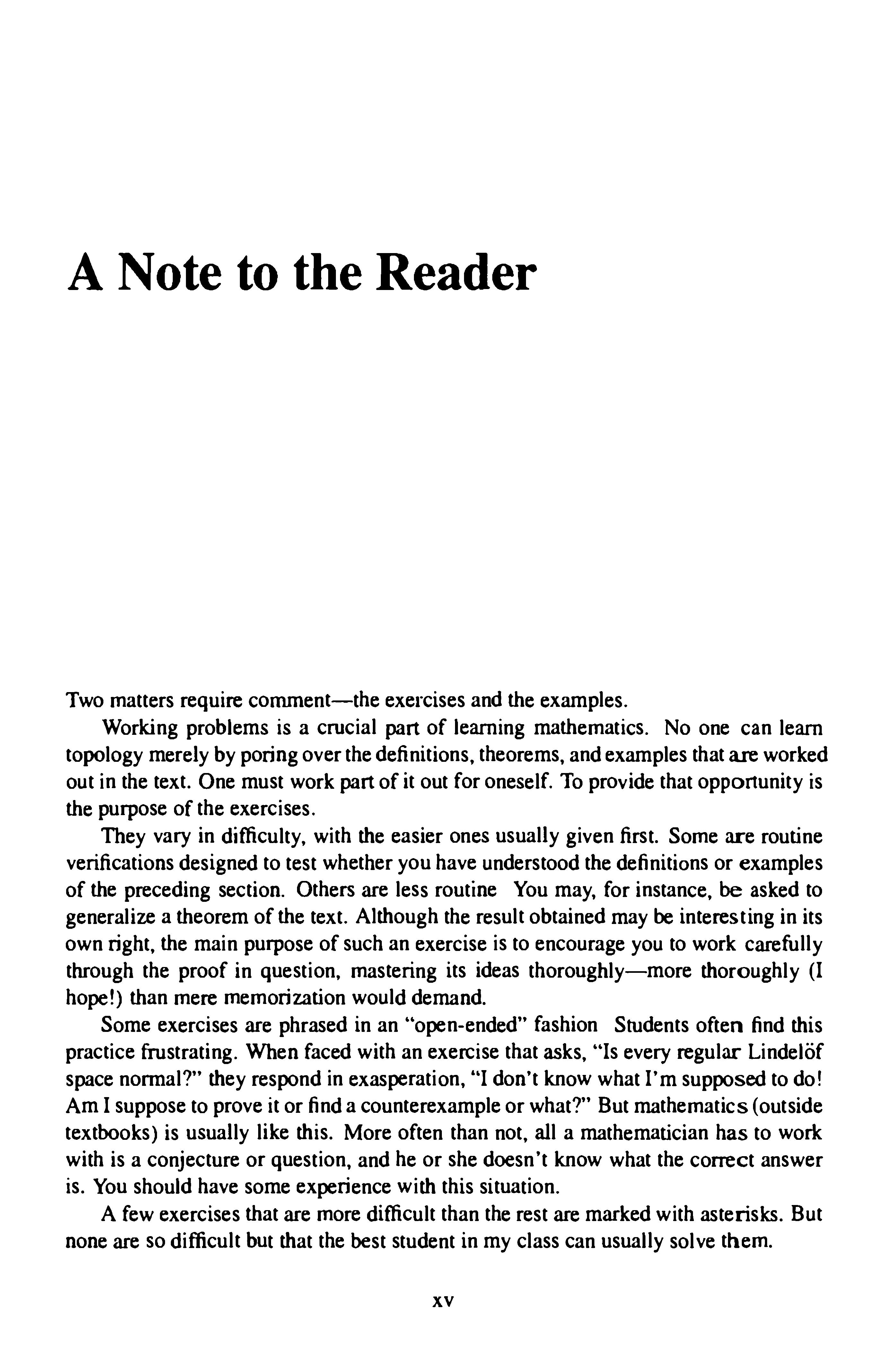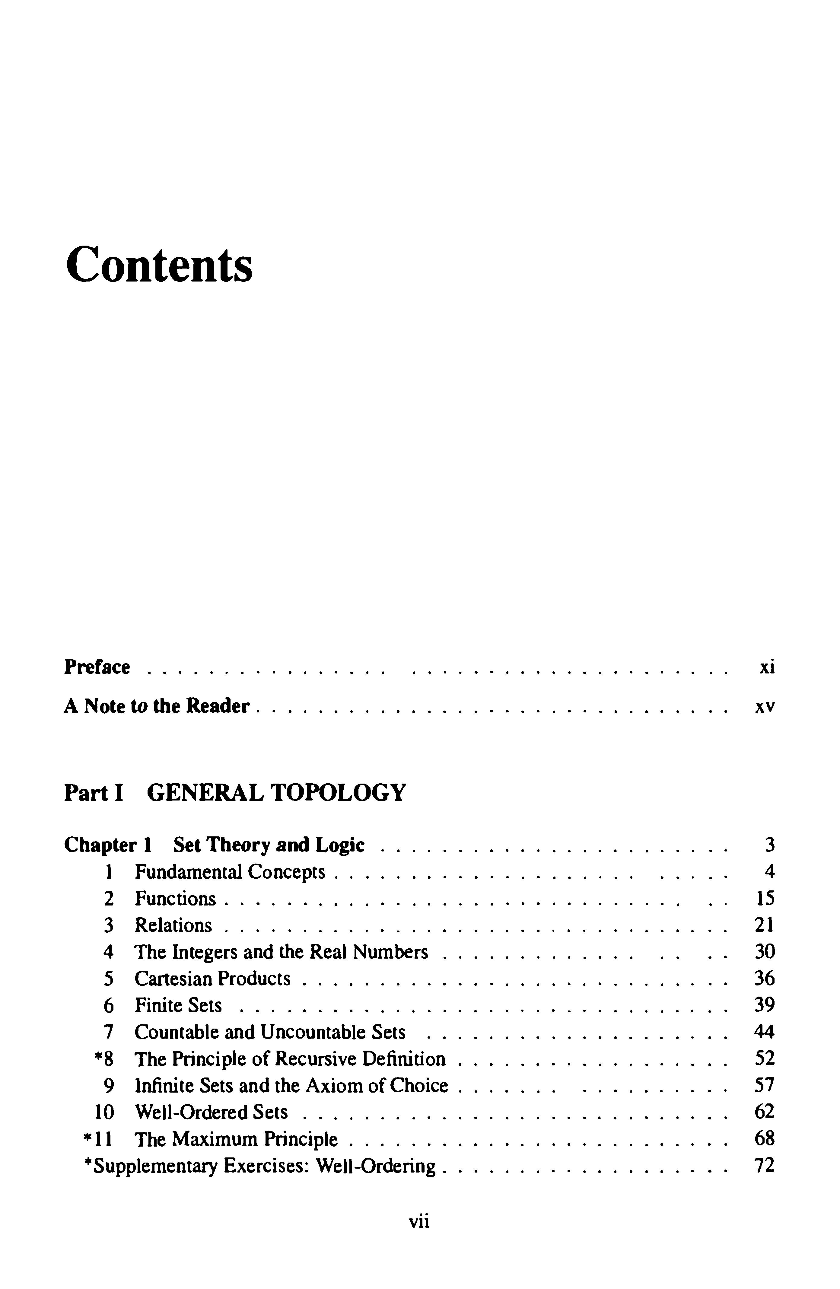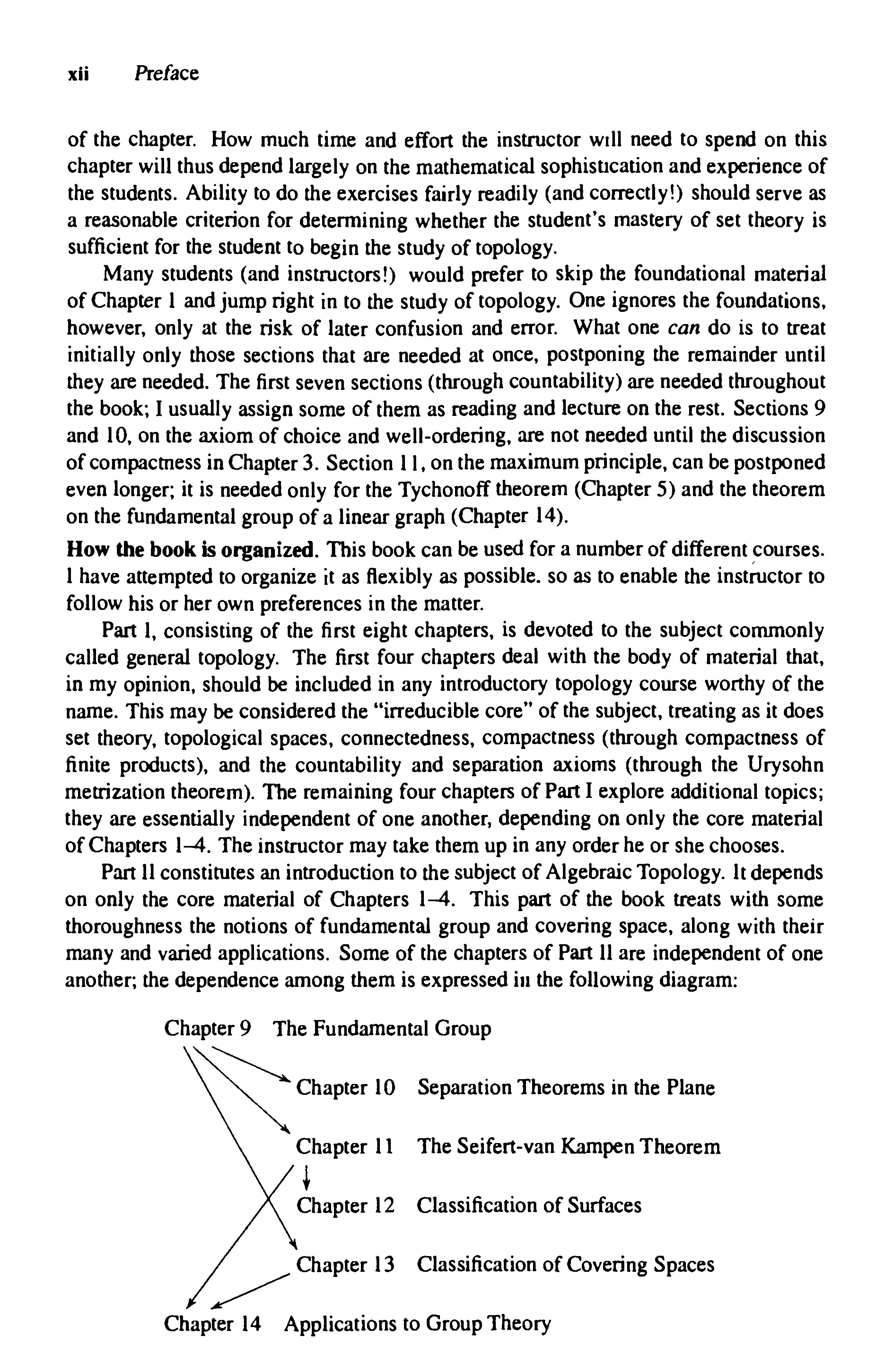 Manystudents(andinstructors!)wouldprefertoskipthefoundationalmaterial ofChapter1andjumprightintothestudyoftopology.Oneignoresthefoundations, however,onlyattheriskoflaterconfusionanderror.Whatonecandoistotreat initiallyonlythosesectionsthatareneededatonce,postponingtheremainderuntil theyareneeded.Thefirstsevensections(throughcountability)areneededthroughout thebook;Iusuallyassignsomeofthemasreadingandlectureontherest.Sections9 and10,ontheaxiomofchoiceandwell-ordering,arenotneededuntilthediscussion ofcompactnessinChapter3.Section11,onthemaximumprinciple,canbepostponed evenlonger;itisneededonlyfortheTychonofftheorem(Chapter5)andthetheorem onthefundamentalgroupofalineargraph(Chapter14).
