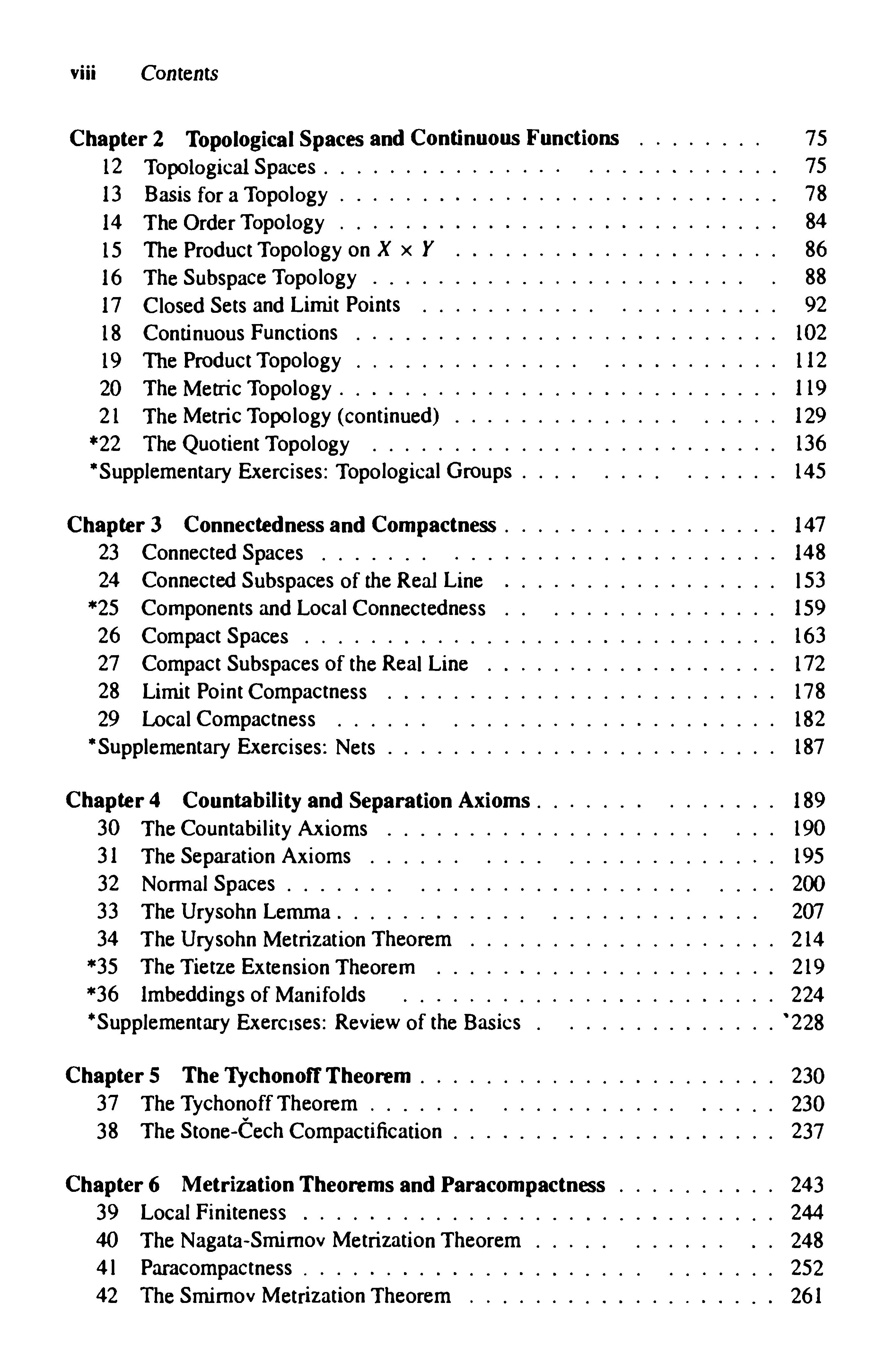 Possiblecourseoutlines.Mostinstructorswhousethistextforacourseingeneral topologywillwishtocoverChapters1—4,alongwiththe theoreminChapter5.Manywillcoveradditionaltopicsaswell.Possibilitiesincludethefollowing: theStone-techcompactification metrizationtheorems(Chapter6),thePeano curve Ascoli'stheorem and/or§47),anddimensiontheory Ihave, indifferentsemesters,followedeachoftheseoptions.