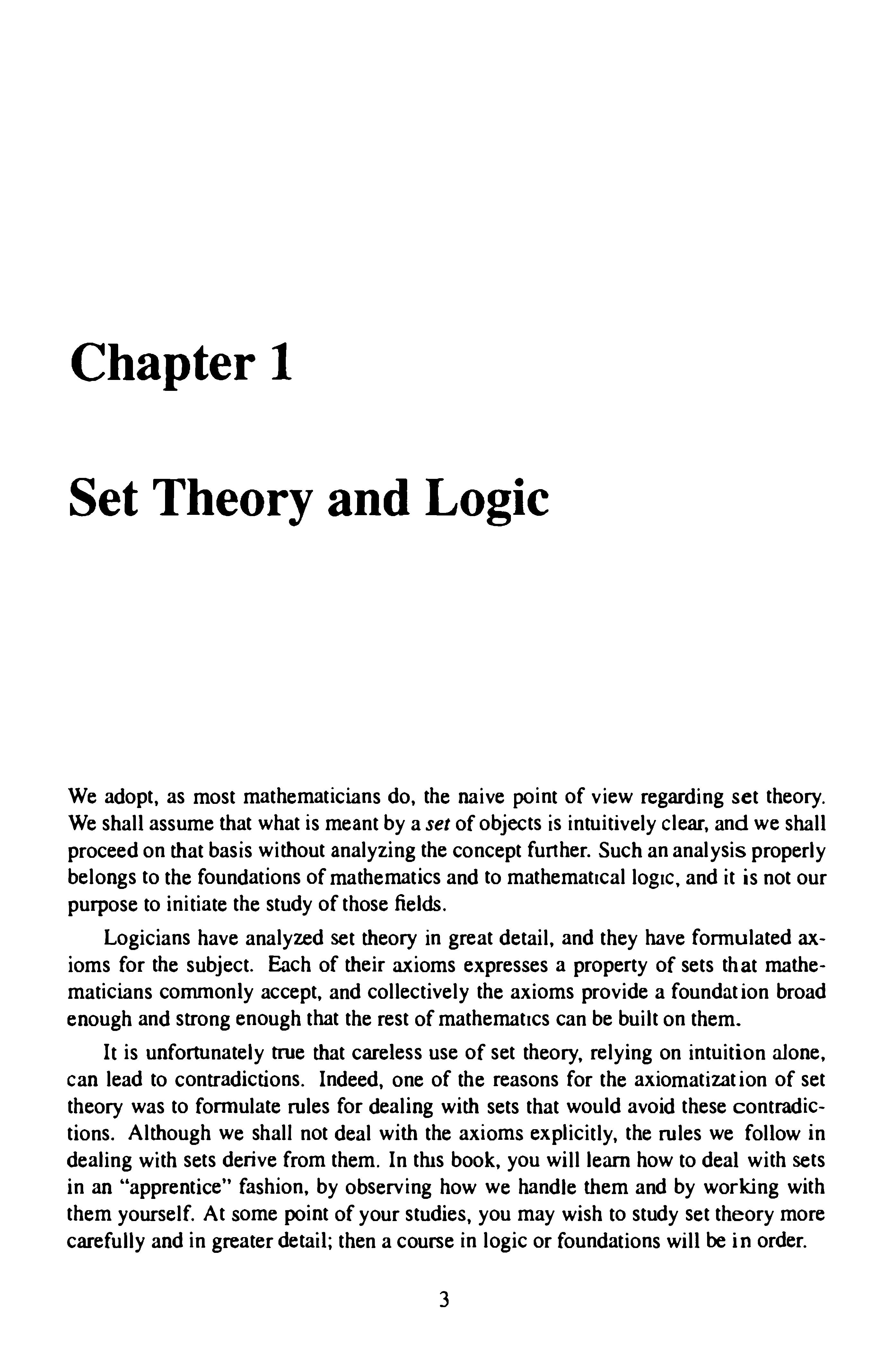 Moststudentsinatopologycoursthave,inmyexperience,someknowledgeof thefoundationsofmathematics.Buttheamountvariesagreatdealfromonestudent toanother.Therefore,Ibeginwithafairlythoroughchapteronsettheoryandlogic.It startsatanelementarylevelandworksuptoalevelthatmightbedescribedas"semisophisticated."Ittreatsthosetopics(andonlythose)thatwillbeneededlaterinthe book.Moststudentswillalreadybefamiliarwiththematerialofthefirstfewsections, butmanyofthemwillfindtheirexpertisedisappearingsomewhereaboutthemiddle