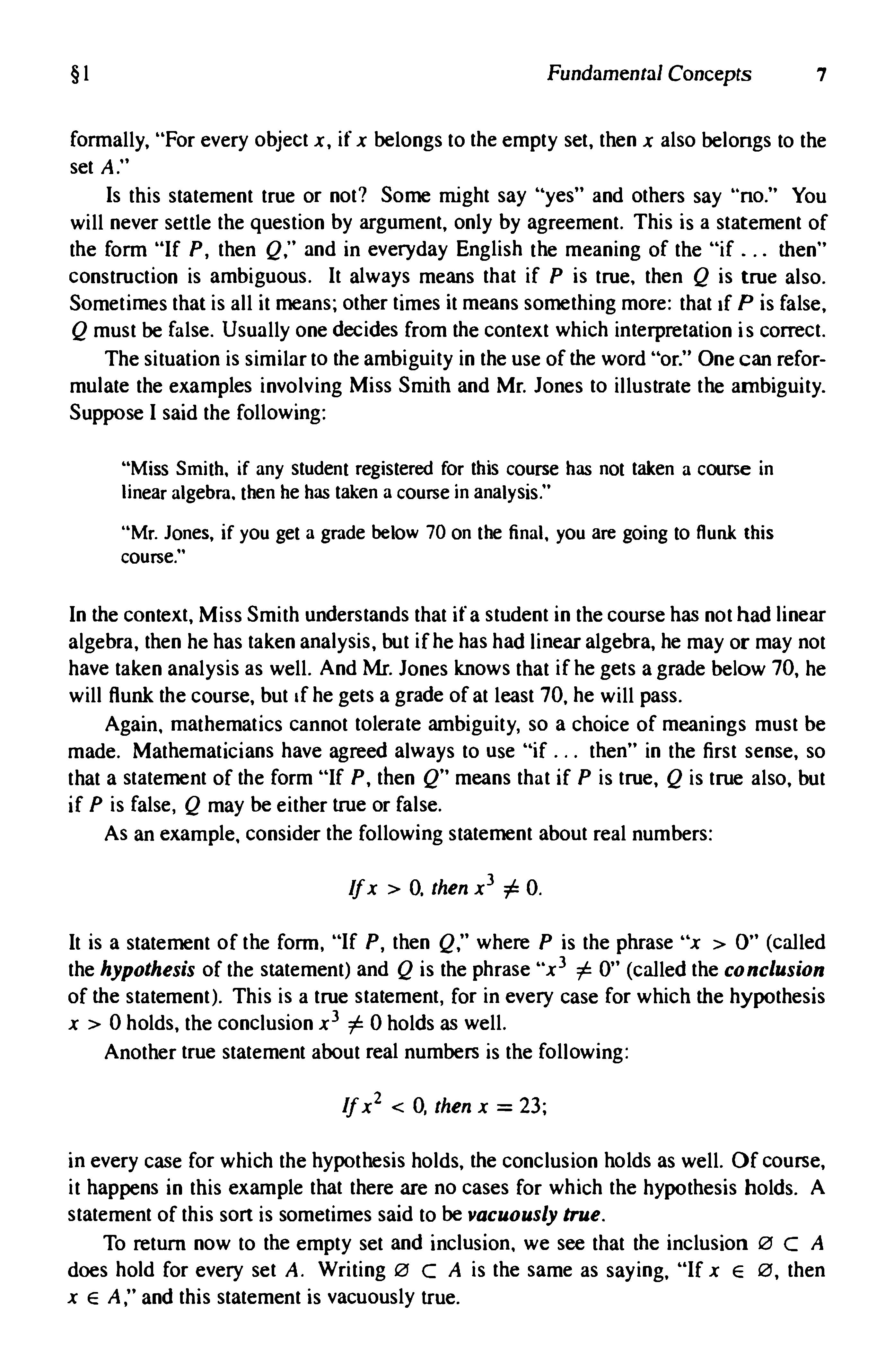 Again,mathematicscannottolerateambiguity,soachoiceofmeaningsmustbe made.Mathematicianshaveagreedalwaystouse"if...then"inthefirstsense,so thatastatementoftheform"IfP.thenQ"meansthatifPistrue,Qistruealso,but ifPisfalse,Qmaybeeithertrueorfalse.
