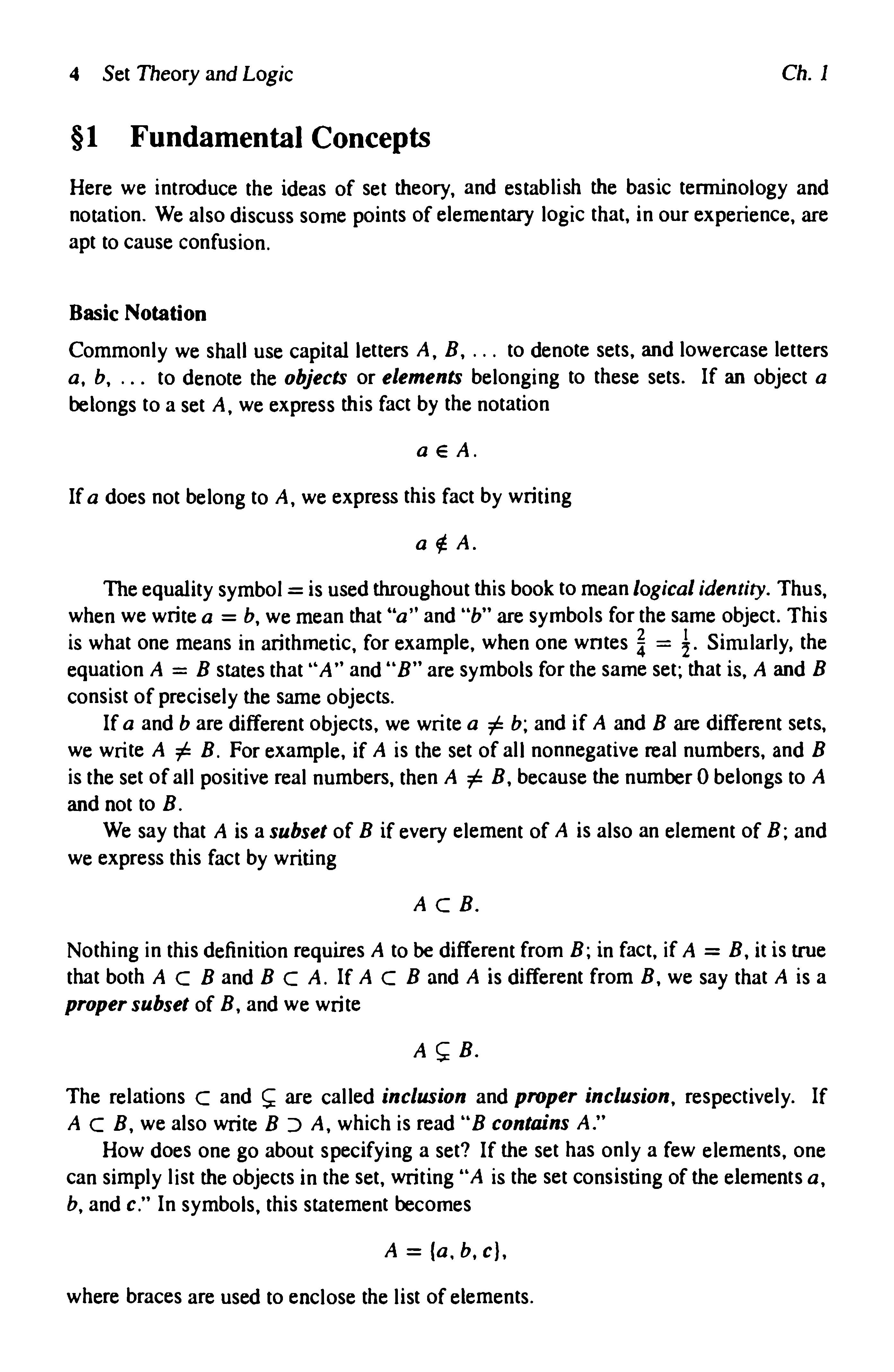 Theequalitysymbol=isusedthroughoutthisbooktomeanlogicalidentity.Thus, whenwewritea=b,wemeanthat"a"and"b"aresymbolsforthesameobject.This iswhatonemeansinarithmetic,forexample,whenonewrites=Similarly,the equationA=Bstatesthat"A"and"B"aresymboLsforthesameset;thatis,AandB consistofpreciselythesameobjects.