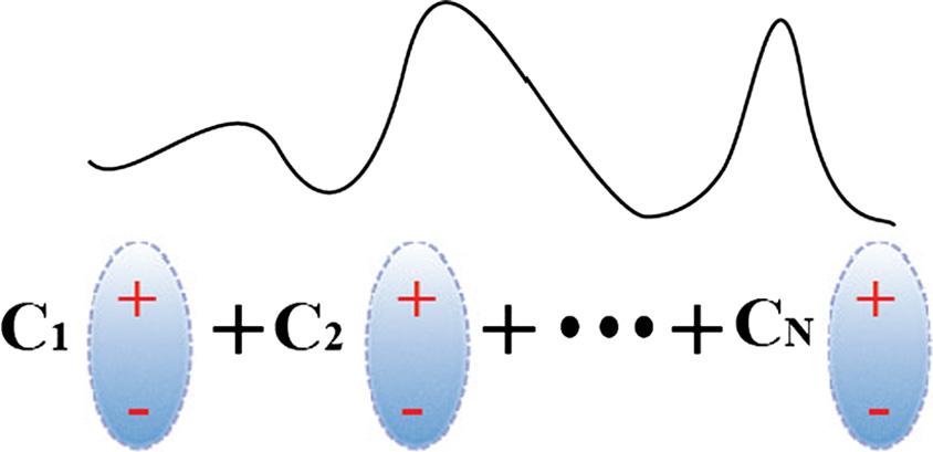 Figure1.1. IllustrationoftheformationofaFrenkelexciton.Eachellipsewith + and representsintramolecularexcitation,andthewholeexcitonstate(black line)isformedasalinearcombinationoftheselocalizedexcitations. C1 , , CN arecomplexcoefficientssuchthat