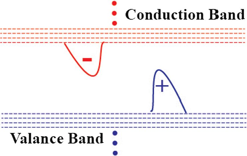Figure1.2. IllustrationoftheformationofWannierexciton.Localized wavepacketsofelectronintheconductionbandandholeinthevalancebandare formedandareboundtoeachotherviaCoulombinteraction.