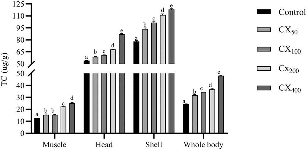 The findings of the shrimp whole-body composition analysis are presented in Table 4 CX50 and CX100 treatments differed significantly (P < 0.05) from the control in crude protein content. In contrast, dietary CX feeding did not significantly affect (P > 0.05) the crude lipid and ash content of the shrimp body.