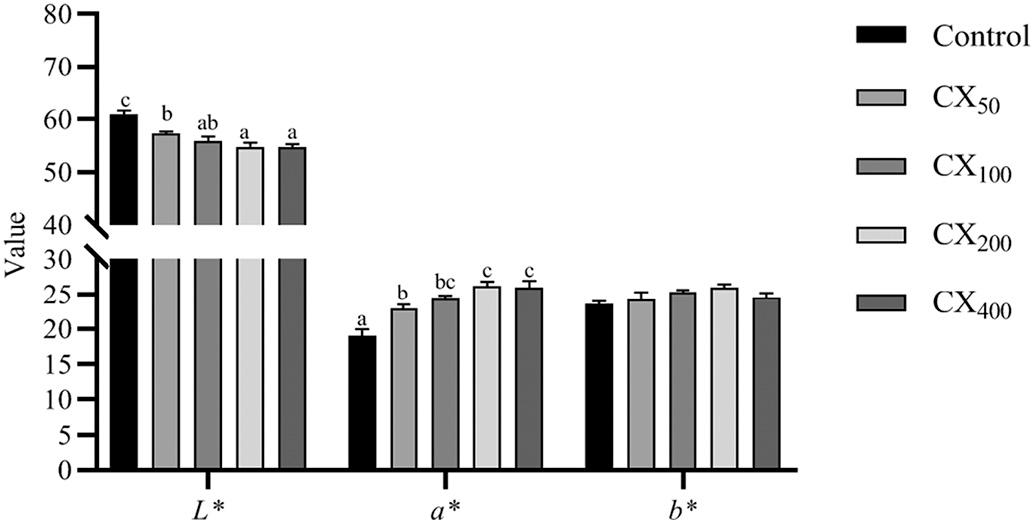 The color reading values of cooked shrimp fed different dietary CX levels are shown in Fig. 1 Shrimp fed with CX-containing diets exhibited higher (P < 0.05) redness (a *) values than the control treatment, however, lightness (L * ) showed an opposite trend. Further, CX100, CX200, and CX400 treatments were similar in a* and L* values. Although yellowness (b*) values were higher in CX fed treatments than in the control, no significant difference (P > 0.05) was observed among treatments.