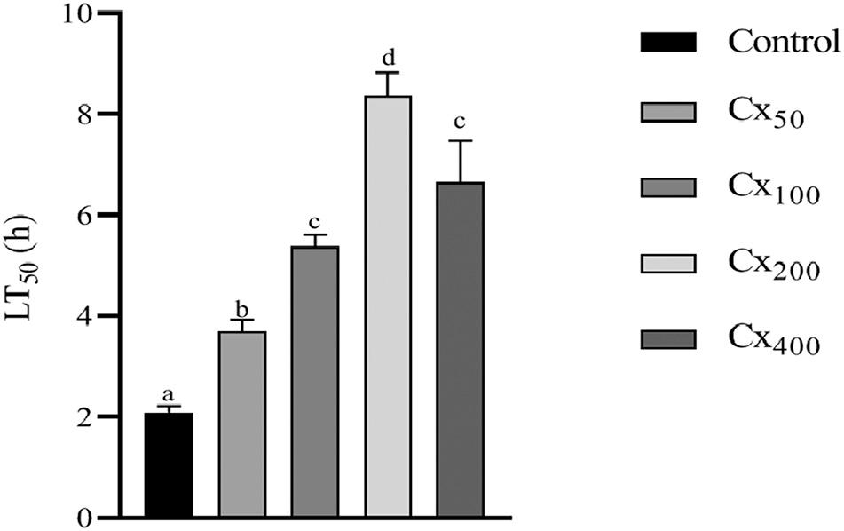 LT50 (X) was obtained when Y = log10 (50) =1.7.