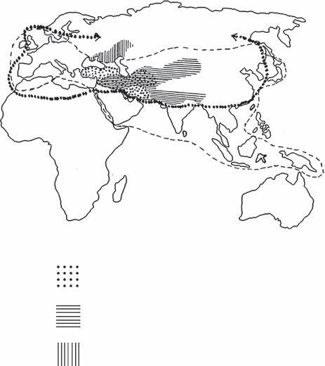 FIGURE 1.1 Distribution of progenitors of domestic animals, showing the likelihood of domestication of livestock species occurring in Western Asia.
