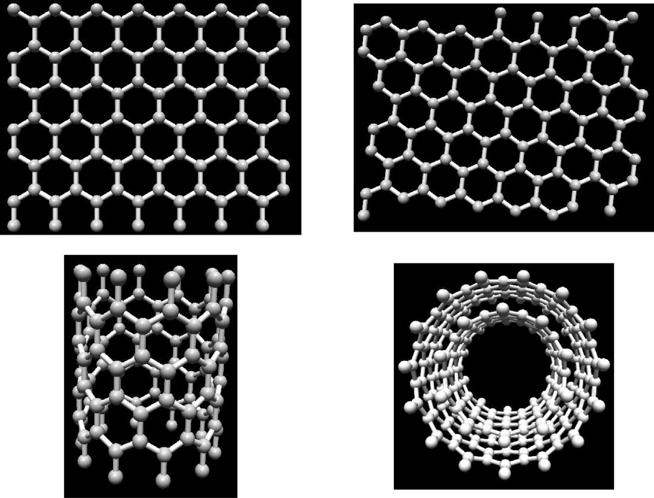 1.4.2Multi-walledCNTs(MWCNTs) ThesearetheCNTsthatcontainmultilayeredgraphenerolledover themselveshavevaryingdiametersrangingfrom2to50nmwhichinturn dependsonthenumberoftubes[58].Itssynthesisiscatalyst-free,andthe MWCTsarehighlycomplexandcannotbetwistedeasily[51].Thesetubes haveadistanceofapproximately0.34nminbetweenlayers[59].Their typicalformappearsinformof fluffyblackandgranularpowders.Thereare MWCNTsoftwodifferenttypesbasedonthegraphiticsheetarrangement pattern.Asanexampleofthis,wecanlookattheRussian-dollmodel wherethegraphiticsheetsformconcentricallyalignedsheets,forexample,a lengthof(0,14)SWCNTsurroundingashorterlength(0,12)SWCNT. Graphiteisrolledarounditselfinthesecondmodel,resemblingascrollof parchmentorarolled-upnewspaper[60].