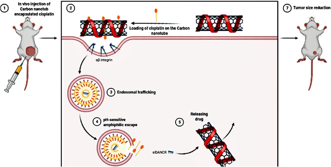 Figure1.6 Schematicillustrationofcisplatindeliverysystemandpossibleinternalizationmethodofcarbonnanotubeincludingloadingofthedrugonthesurfaceof carbonnanotube,thencisplatincarriedinside,invivostudyofcurrentnanocarrierand pH-responsivereleasingdrugleadingtodecreasingoftumorsize.