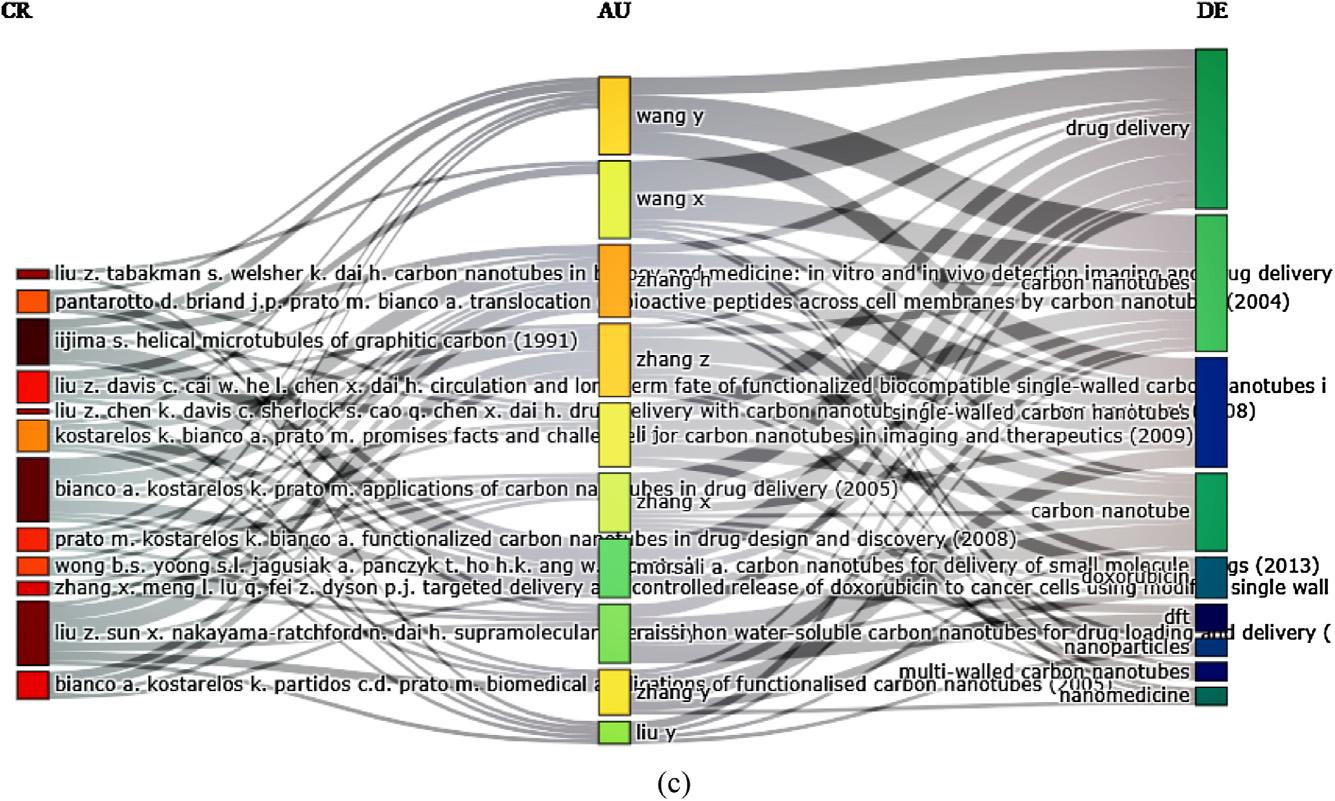 Figure1.4 Publicationofcarbonnanotubeindrugdeliverysystemresearchpapers: topcountriesandclusters(aandb),and(c)three-fieldplotoftop-author,topcountries;andtopauthors’ keywordsontheconsideredtopic.