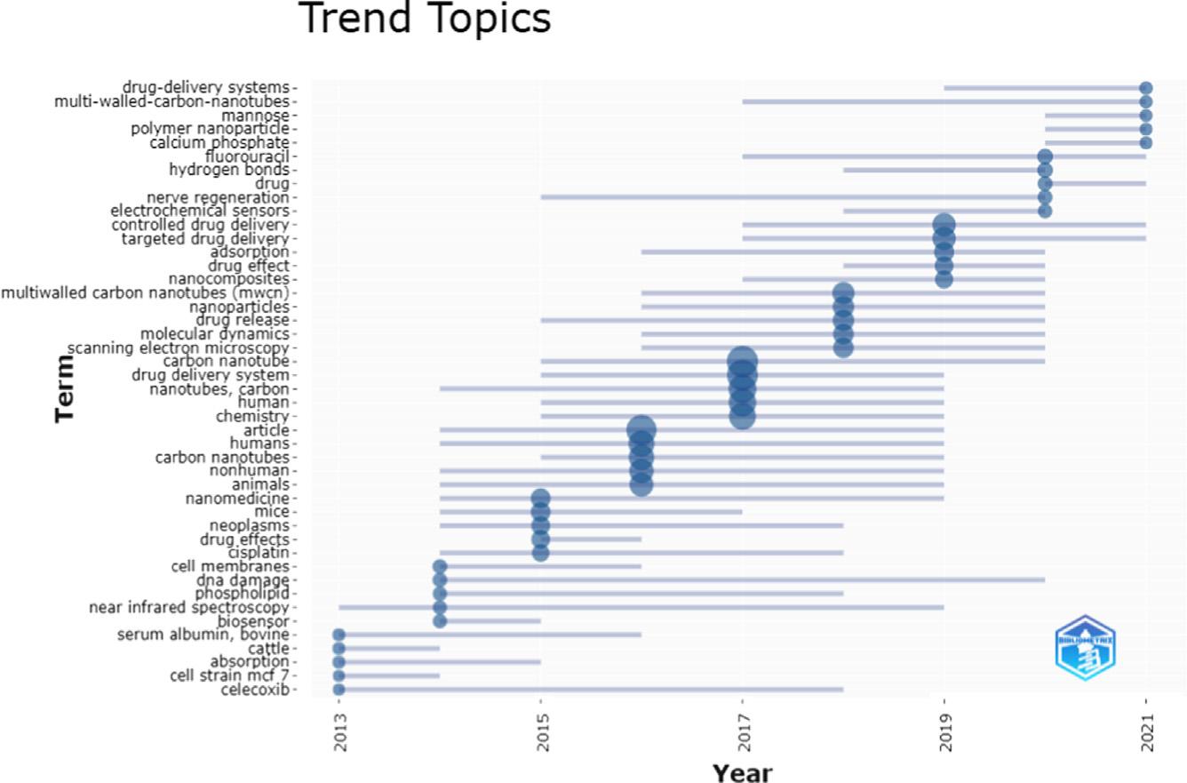 theschematicrepresentationofyearlyincreasesinrecordnumbers. Researchoncarbonnanotubeanddrugdeliveryshowsaslowonsetwith fewpublicationsbetween2012and2016.Thetrendwasdownwardfrom 2016to2017.Asexhibitedinthetrendtopicgrowth,anincreasewas depictedin2017basedonbothkeywordscarbonnanotube,anddrug deliverysystem,whichthereisagoodconsolidationwithpublication trends.By2022,therewillbeanincreasingtrendinpublications.The recordsshowedgrowthbetween2017and2020from9%to14%.There were135,164,and178recordspublishedin2019,2020,and2021, respectively,andapercentageof10%,12%,and14%wasrecorded.New developmentsandapplicationindrugdeliveryandcarbonnanotubes relatedmaterialsexplainstheincreaseinpublicationssince2017.