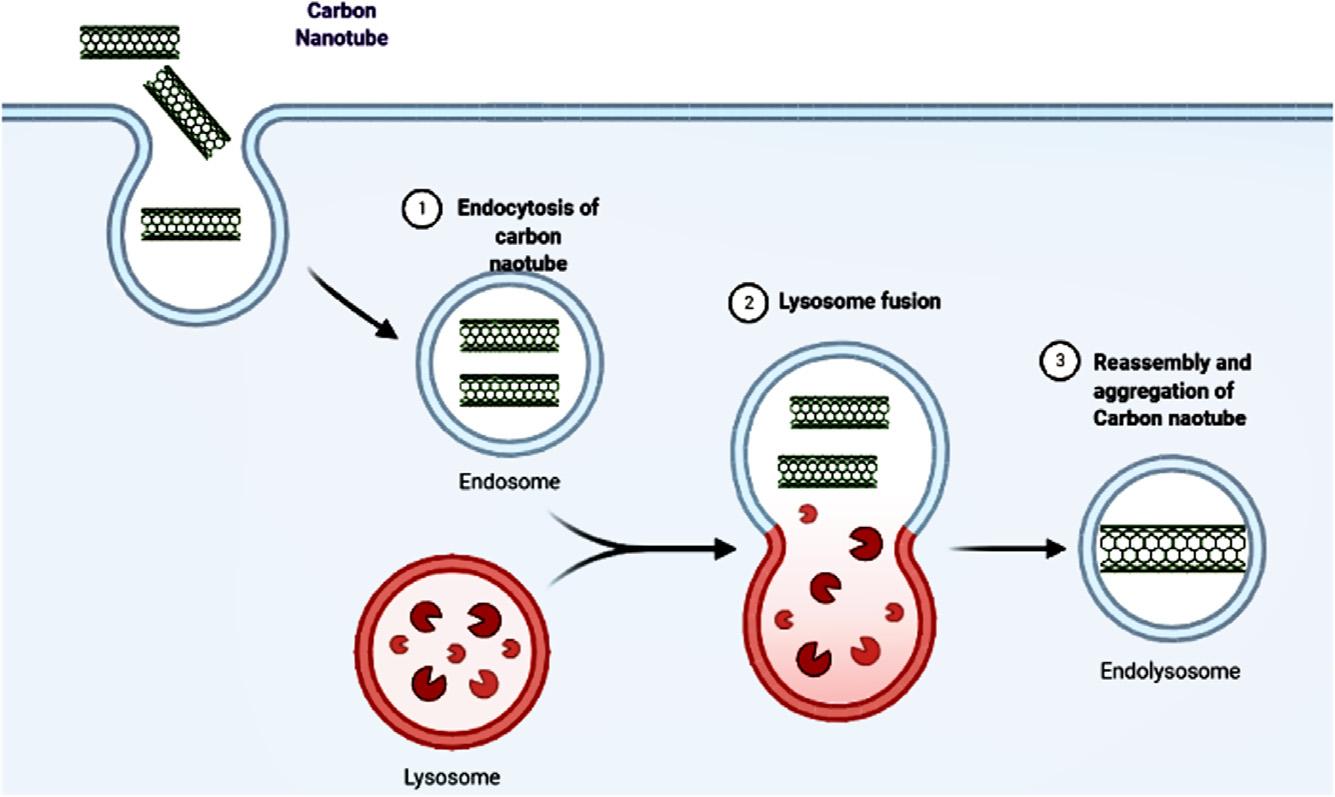 ThedistributionofCNTswithincellscanoccureitherpassively throughdiffusionacrossthecellmembranelipidbilayerorthroughneedle mechanisms.CNTsovercomesuchbarriersduetotheirneedle-like structureandhighrespectratios[27].CNTscanalsobeinternalizedby endocytosis,whichcanbeclassifiedinto fivegroups:phagocytoses,pinocytosis,caveolin-mediatedendocytosis,clathrin/clathrin-mediatedendocytosis,andclathrin/caveolaeindependent.Aphagocyticpathwayisthe processinwhichlargeparticles(w1 mm)entercells.Itpredominantly occurswithinneutrophils,macrophages,andmonocytes.Cellularuptake occursprimarilythroughreceptor-mediatedendocytosis,whichinvolves clathrin-coatedendocyticvacuoles.Caveolaegetsinvadedbynanomaterials 60nmindiameter,whichcontainshighlevelsofcholesterolandsphingolipids.TheCaveolin-mediatedendocytosisprocessisresponsiblefor transportingvesicularmaterialandentrappingvirusesandbacteria.Caveolin andclathrinareknowntoplayaroleincellularendocytosisandcan facilitatetheinternalizationofCNTswithadiameterof100nm.