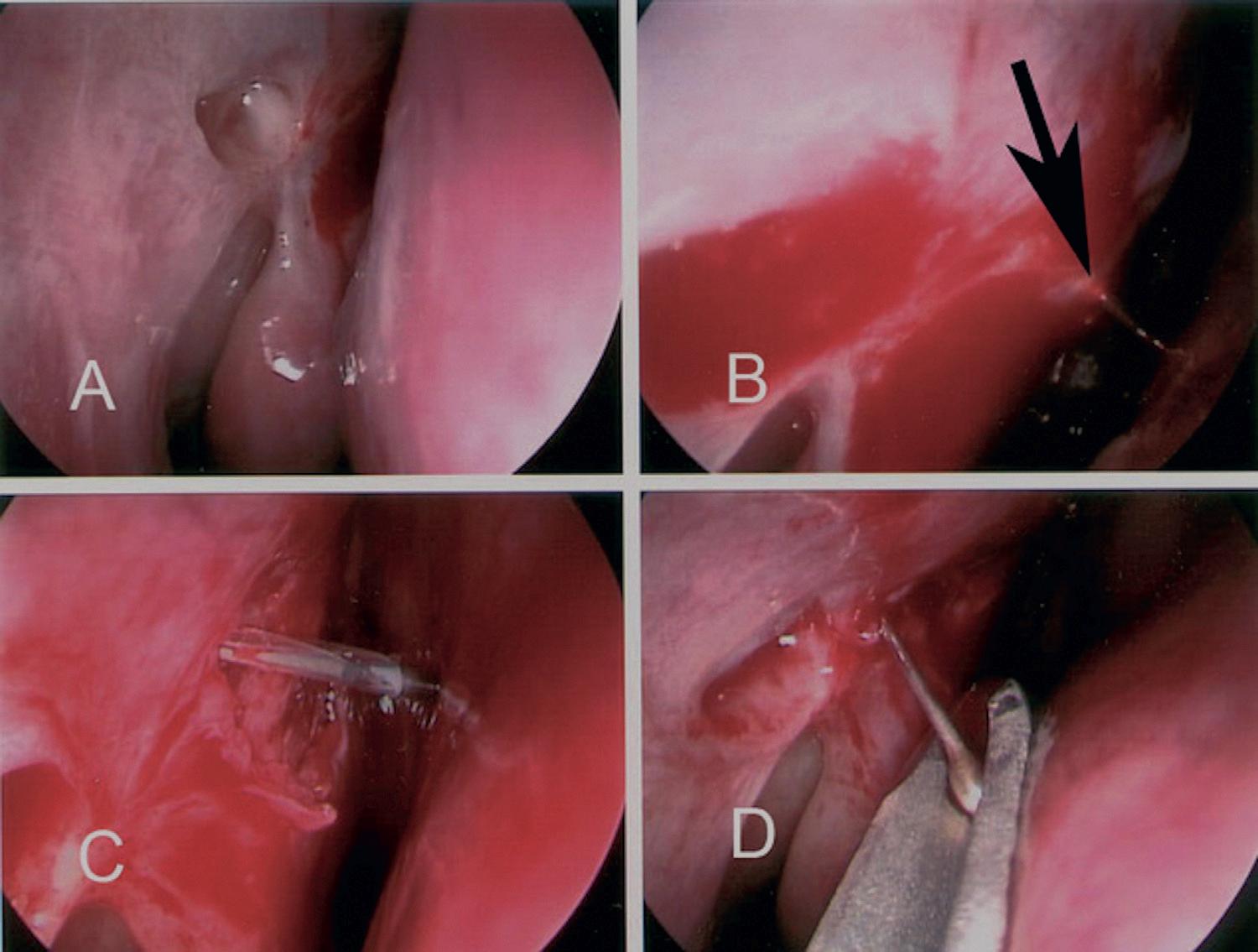 • Fig.2.1 Endoscopictransnasalsurgicaltechniqueslargelydevelopedinotolaryngologyhavebeenadopted byophthalmologistsandoculofacialsurgeonsforlacrimalandorbitalsurgery.Imagesfromanendoscopic revisiondacryoycystorhinostomyshow(A)thenonfunctionallacrimalostium;(B)asharpdilator(arrow)penetratingatthesiteoftheproposedostium;(C)aballooncatheterabouttobeinflatedtoensureanadequate openingaftertheremovalofsomemucosa;(D)retrievaloftheCrawfordlacrimalstentswithanasalgroove director.
