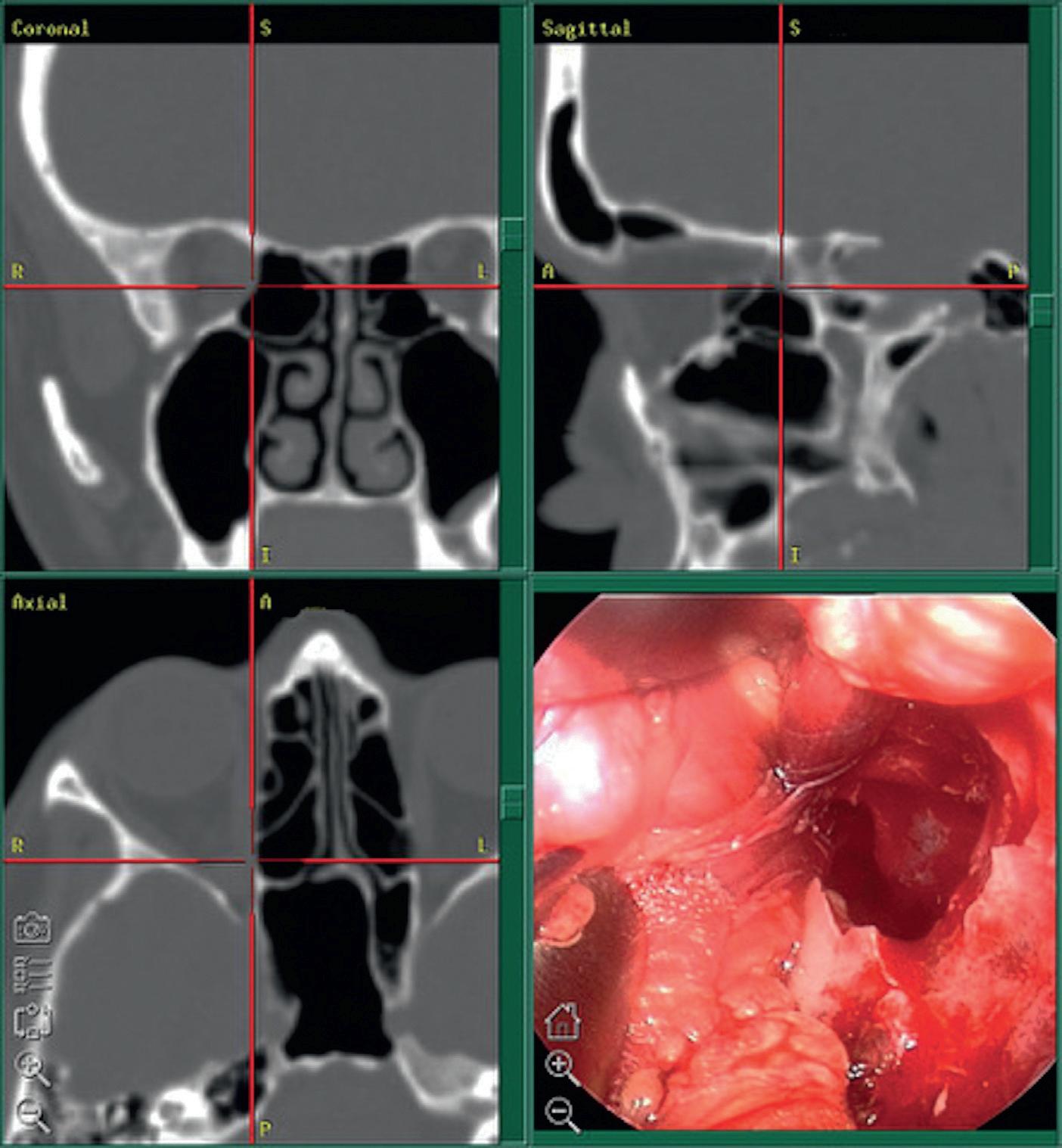 • Fig.2.2 Endoscopicvisualizationthroughtheorbitandsinus(bottomright)andastereotacticlocalization system(topleft,coronal;topright,sagittal;bottomleft,axial)areusedtoenhancepatientsafetyintheresectionofanapicalorbitaltumorbetweenthemedialrectusmuscleandtheopticnerve.