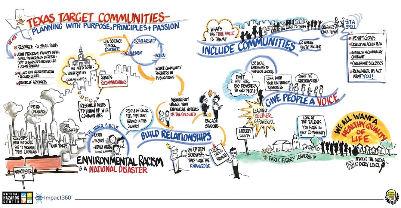 The Institute for Sustainable Communities (IfSC) with the Texas Target Communities Program of Texas A&M University has partnered with civic clubs and nonprofit organizations in inner city Houston, but Houston is not alone. We have worked in rural places in Texas, like the cities of Nolanville and La Grange, and counties including Liberty and Grimes County.We have worked with small communities like Buffalo, Texas with less than 2000 in population, to large multicounty regions, like the Southeast Texas Regional Planning Commission. We have worked side by side with communities to think about hazards, and we have been a resource to communities recovering from wildfires, technological events, tornadoes, and flooding. All communities we have worked with say the same things. We want safe places, we want higher quality of life, we want, as Judge of Liberty County put it, “a place we’d be proud for our kids and grandkids to live in.”