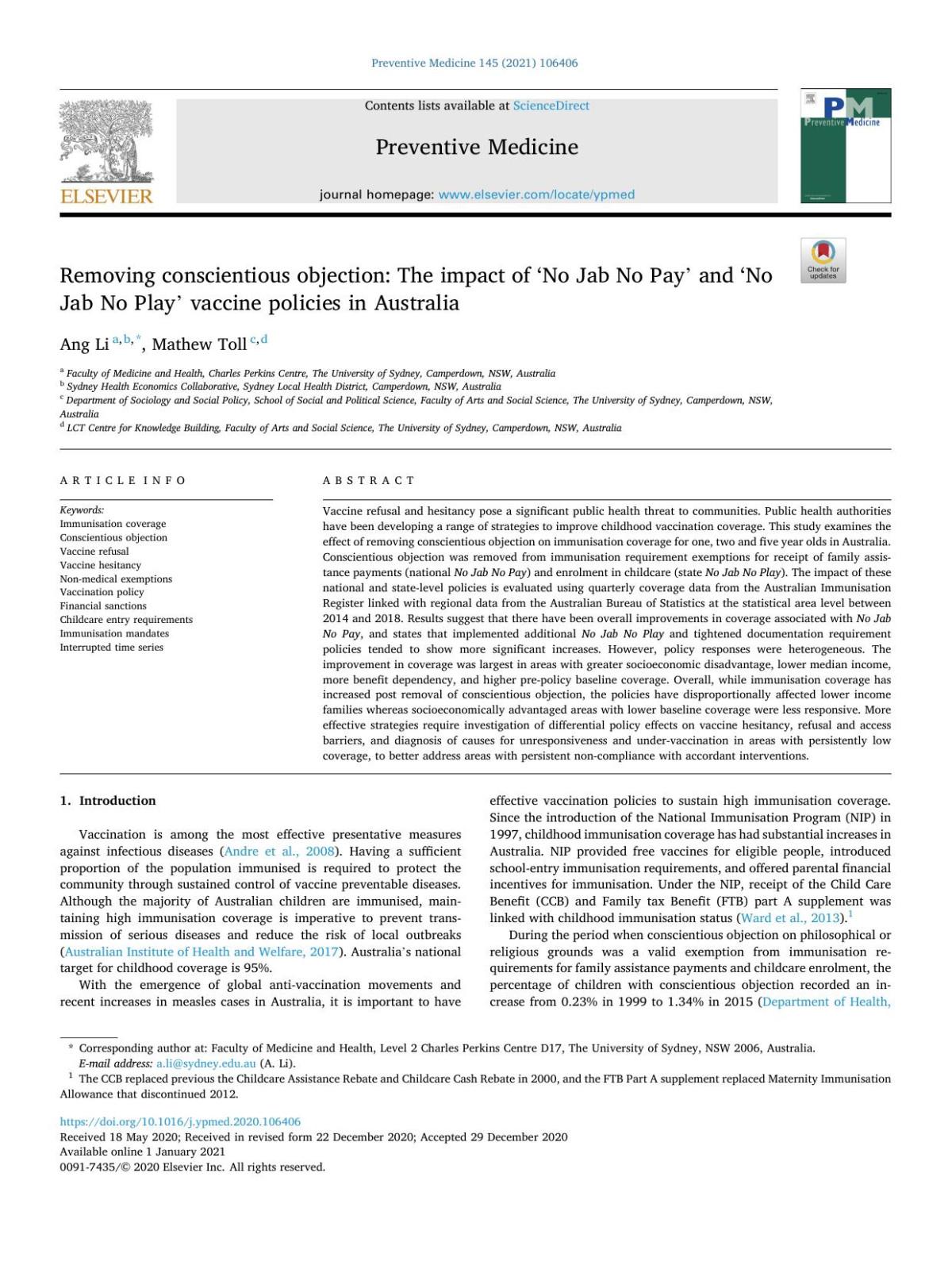 Removing conscientious objection: The impact of ‘No Jab No Pay’ and ‘No Jab No Play’ vaccine policies in Australia Ang Li And Mathew Toll