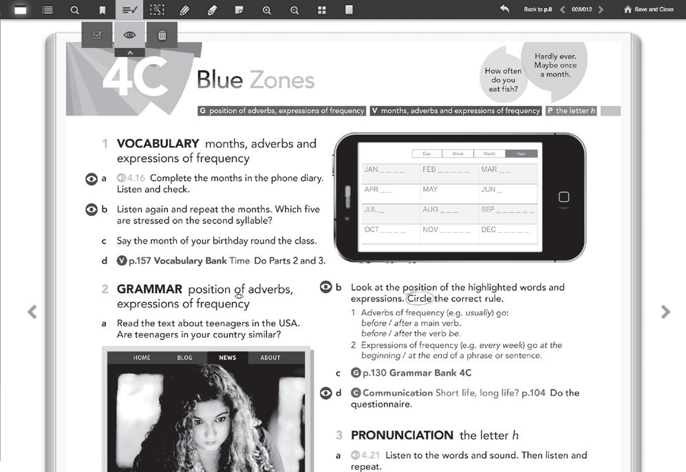 Every lesson focuses on high frequency vocabulary and common lexical areas, but keeps the load realistic. All new vocabulary is given with the phonemic script alongside, to help students with the pronunciation of new words. Many lessons are linked to the Vocabulary Banks which help present and practise the vocabulary in class, give an audio model of each word, and provide a clear reference so students can revise and test themselves in their own time. Students can review the meaning and the pronunciation of new vocabulary on Online Practice, and find further practice in the Workbook